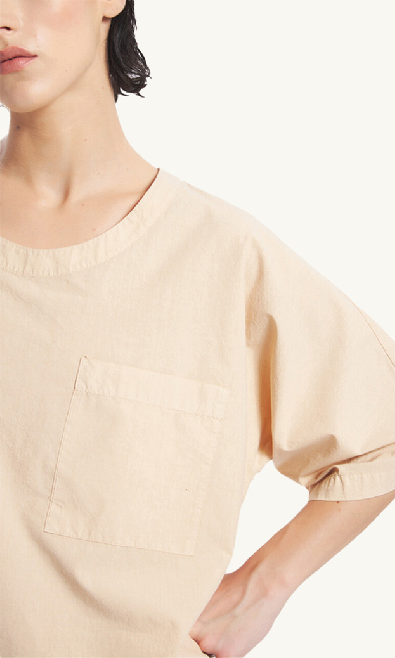 Il offre une coupe oversize, des manches courtes kimono, une encolure ronde, et une poche plaquée.