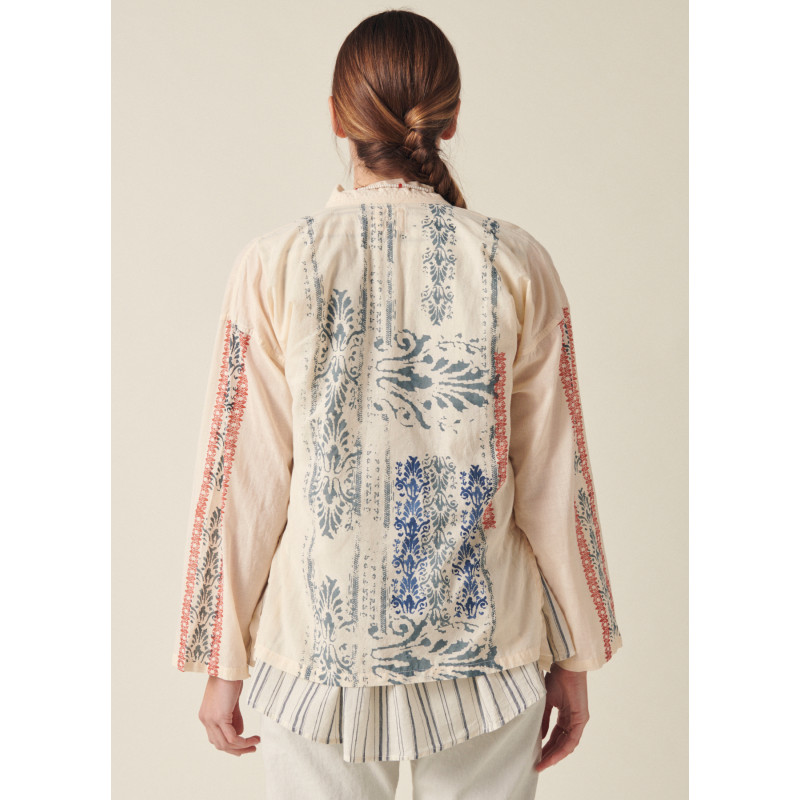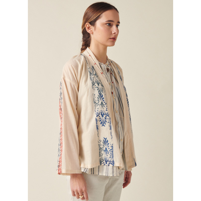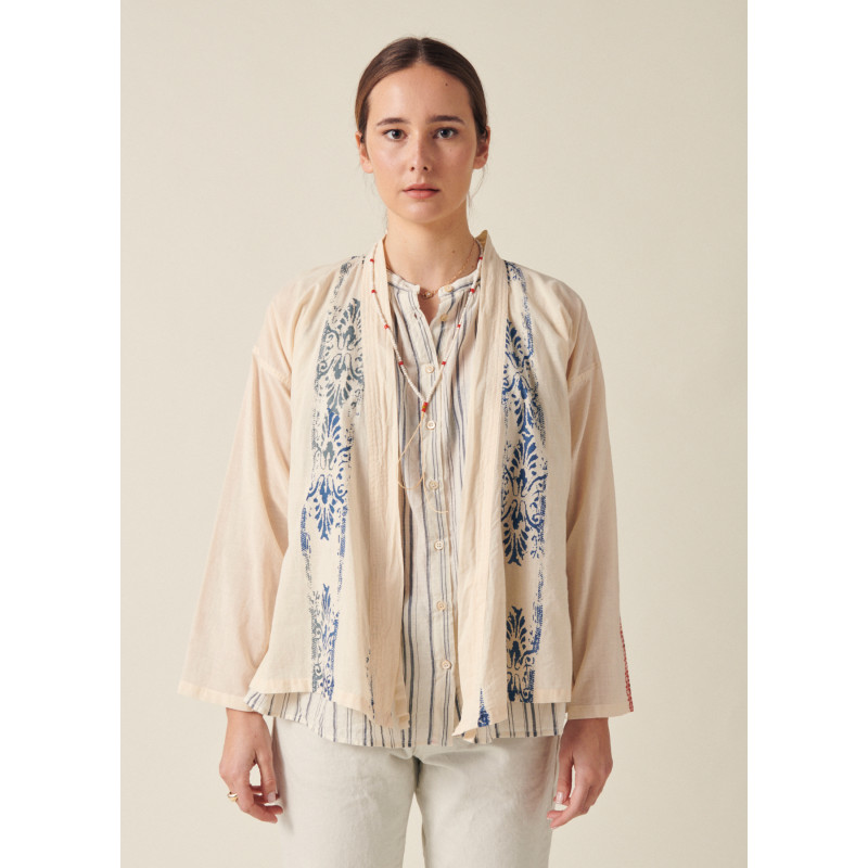 Veste fluide façon kimono Bsbee écrue avec imprimés verticaux, col V, manches longues, ourlet droit, lien à nouer.