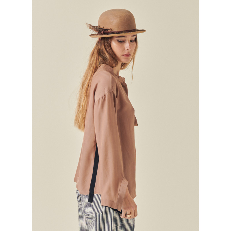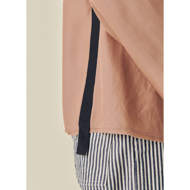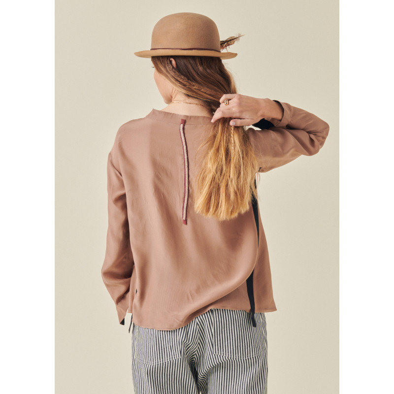 Blouse en soie de la marque Ibrigu, couleur rose pâle, manches longues, brodée avec des imprimés botaniques, boutonnage pour fermer le haut de la chemise.