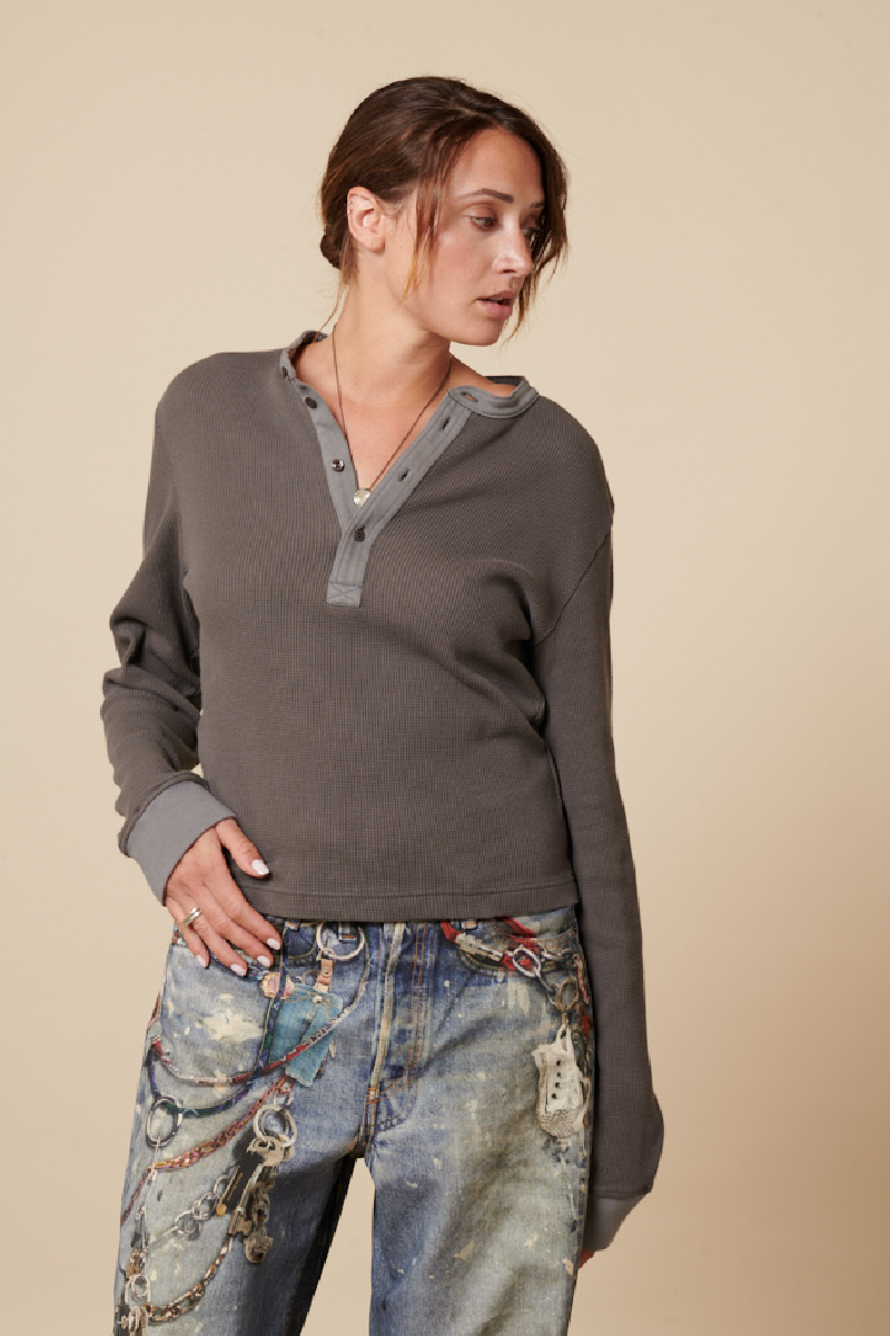 T-shirt en tricot gaufré de coton teint en plongée de la marque Acne Studios, avec une garniture en jersey de coton. Il possède un col ras du cou et une patte à quatre boutons. Un écusson en caoutchouc avec logo est présent à l'arrière.