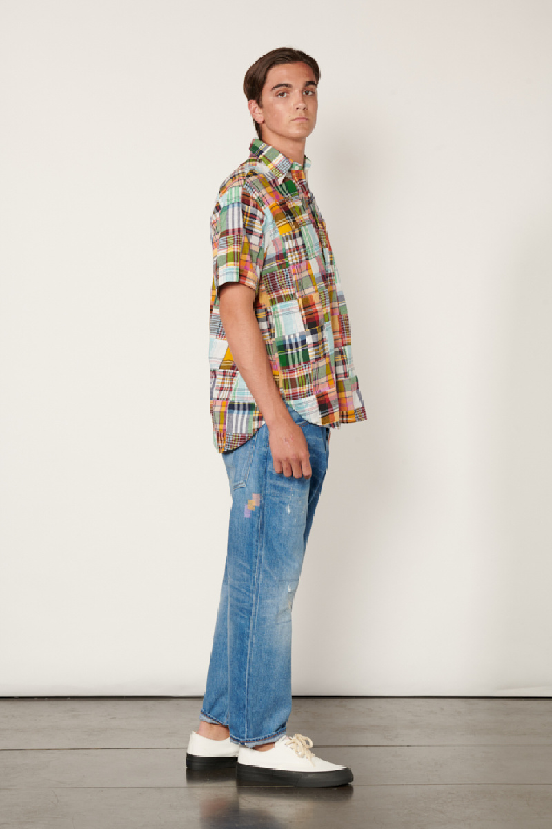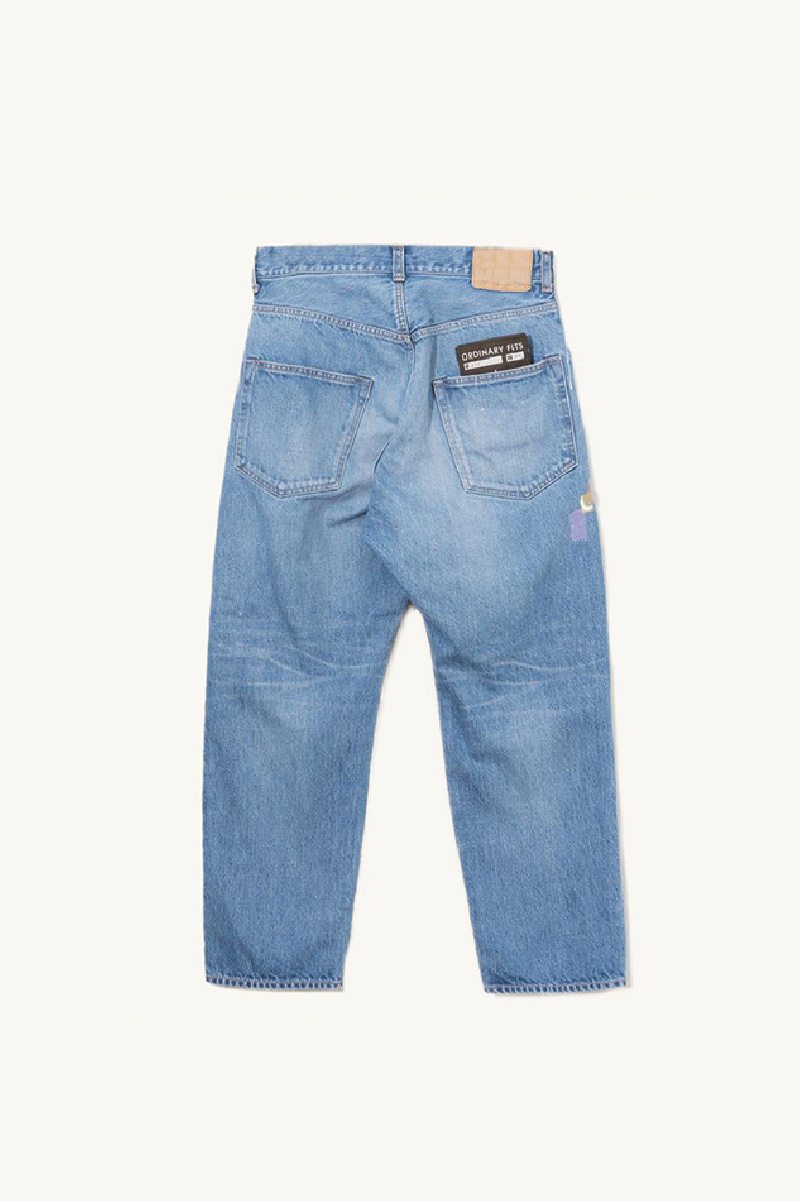 Jean Loose Ankle Remake, Ordinary Fits, couleur bleu jean usé, taille mi-haute, boutons de fermeture à l'avant, couple ample et décontracté, ourlets droits, étiquette en cuir sur l'arrière, petit détail léger de patch de couleurs sur l'avant et le haut arrière de la pièce et effet usé sur la longueur des jambes.