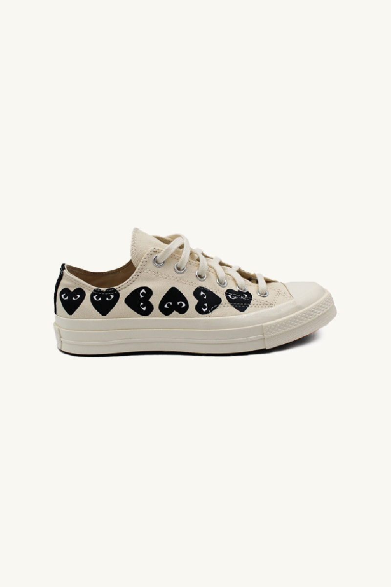 Baskets basses blanches multi herart Chuck 70 X CDG play à logos noir, bout rond renforcé en caoutchouc, laçage blanc, image à logo noir, blanc et noir imprimé sur les côtés, semelle blanc cassé en caoutchouc à logo au talon, ferrures argentées. Conçu dans le cadre de la collaboration Comme des Garçons Play X Converse.