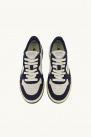 La paire de baskets Autry, modèle Medalist Low en daim écru avec empiècement bleu, présentent un avant-pied perforé et renforcé, une semelle en caoutchouc et en cuir avec des lacets plats blanc en coton.