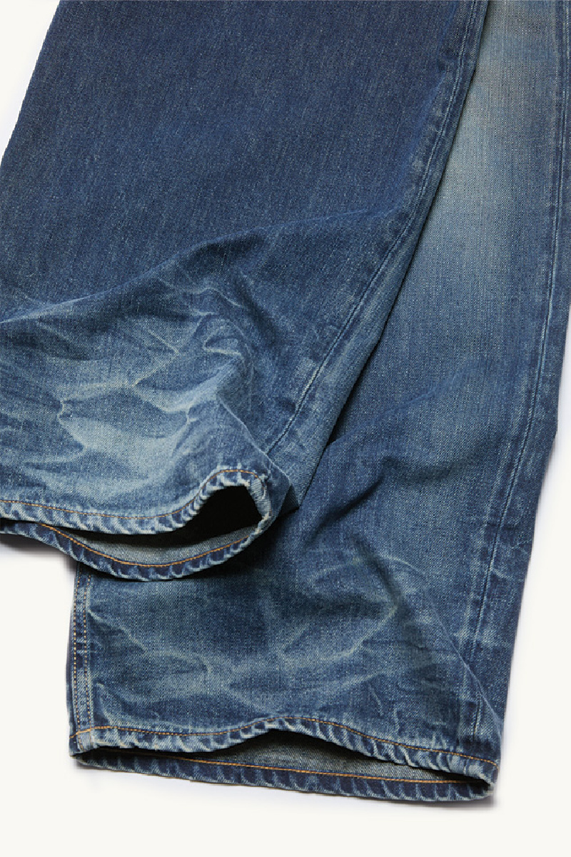 Confectionné en denim non extensible, il se distingue par un délavage bleu moyen.