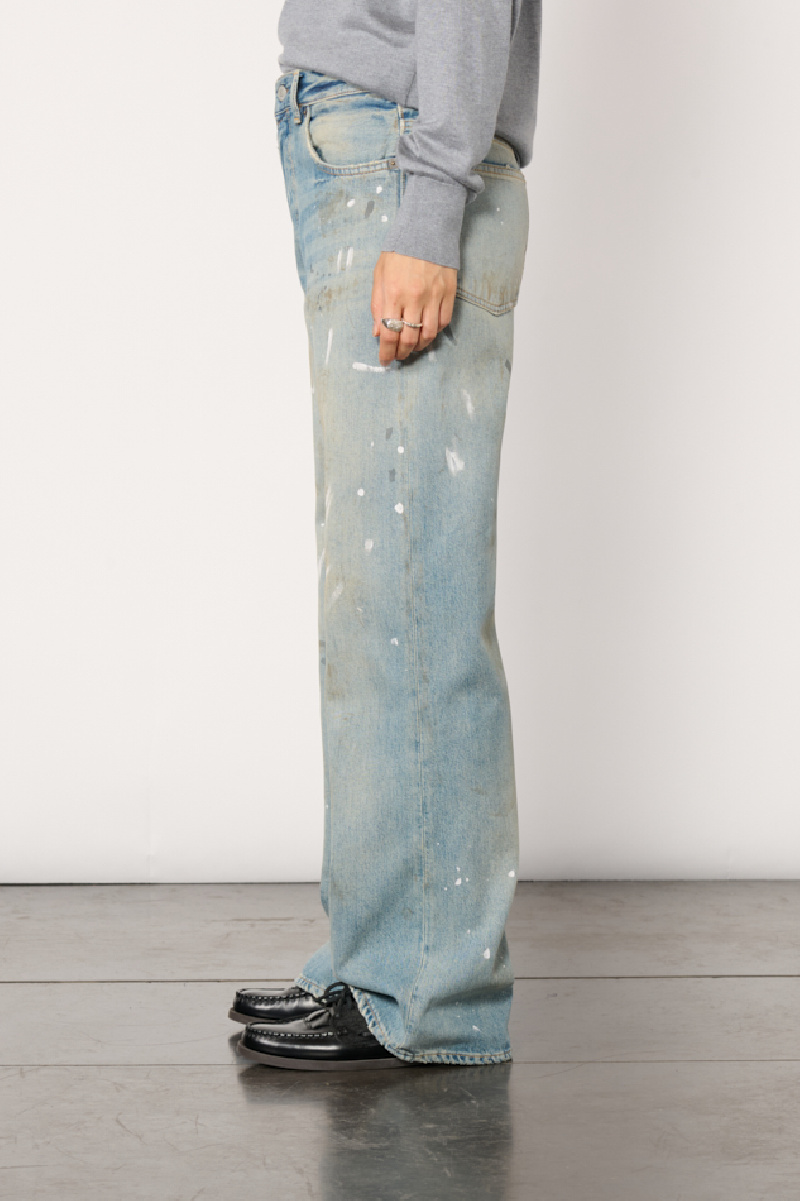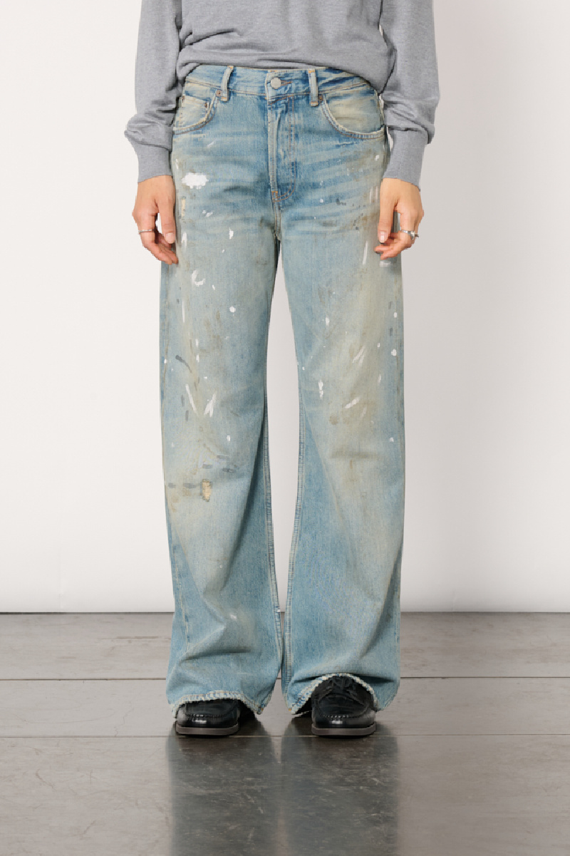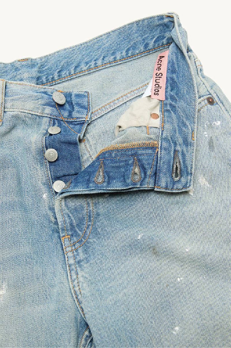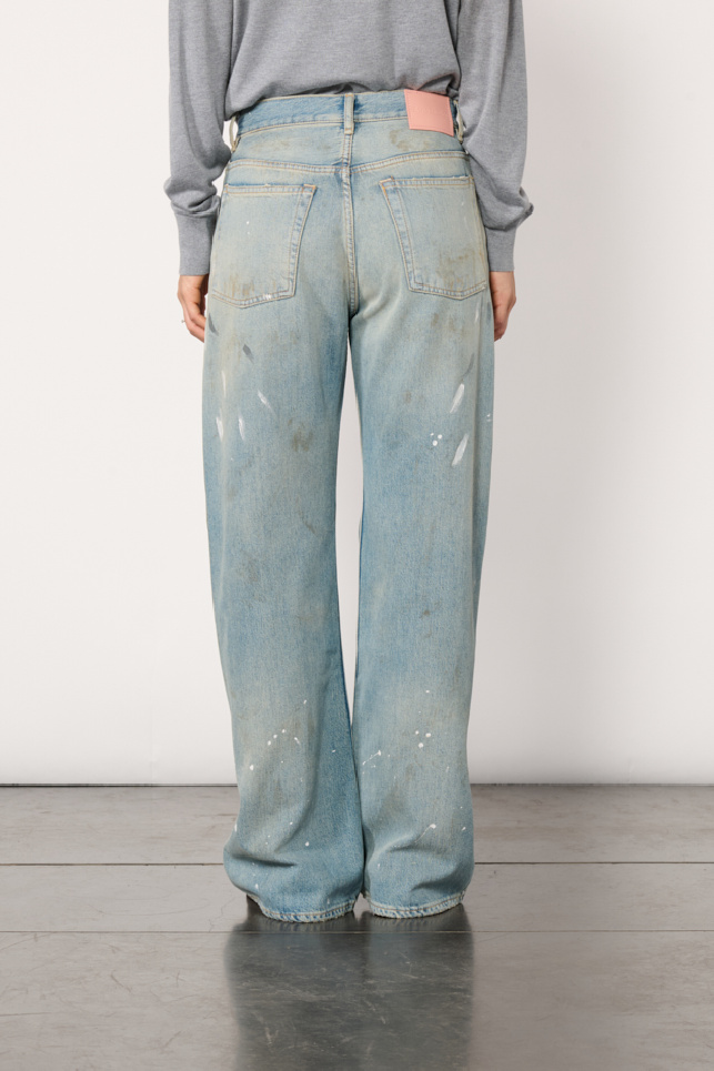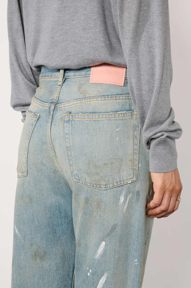 Jean 2021 Trafalgar, confectionné en denim brut bleu clair, avec des détails teintés et peints, de la marque Acne Studios.