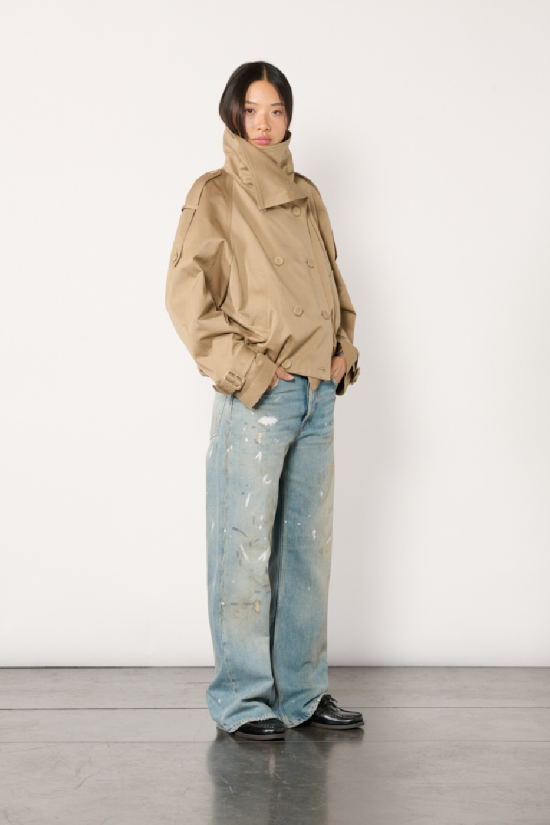 Il dispose également d'une construction classique à cinq poches et d'une braguette à boutons.