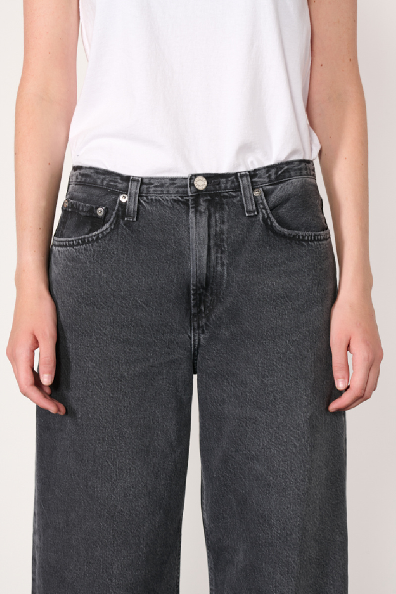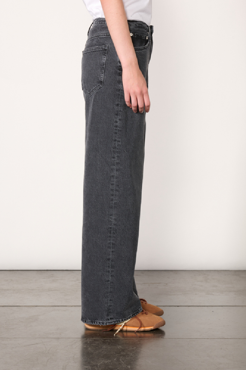 Jean confectionné dans un denim de coton noir, rigide non extensible, avec un délavage moyen à marbrures et moustaches, de la marque Agolde.