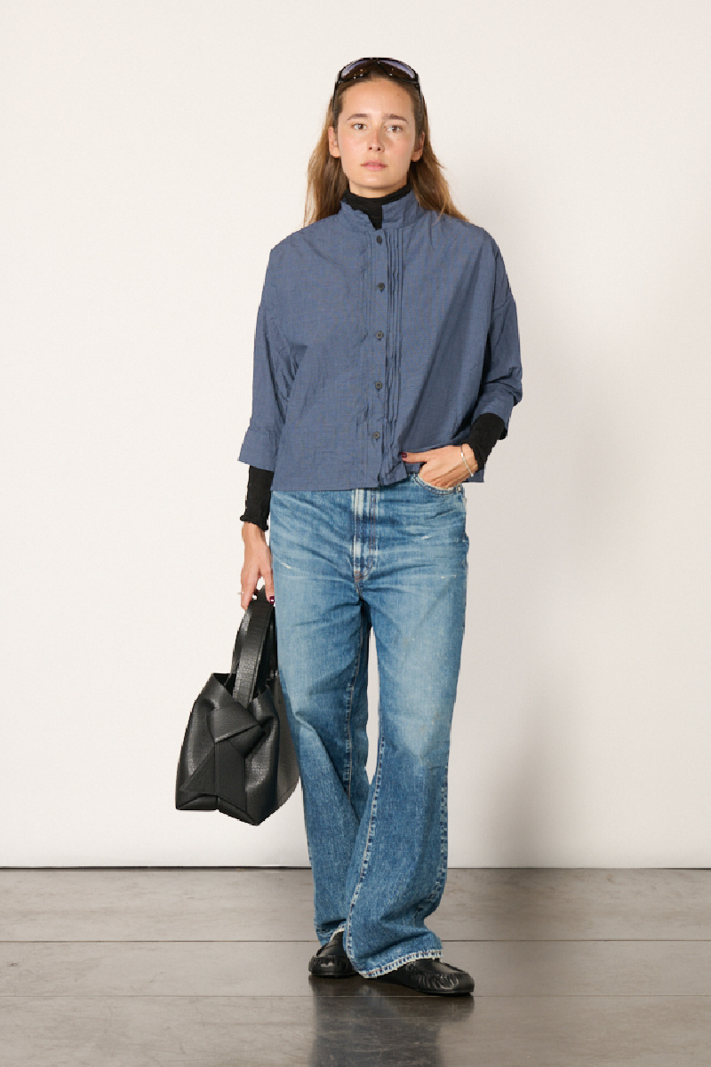 Jean Olivia confectionné dans un denim non extensible Mid-Blue, au délavage Aged et aux finitions Used, de la marque japonaise Upper Hights.