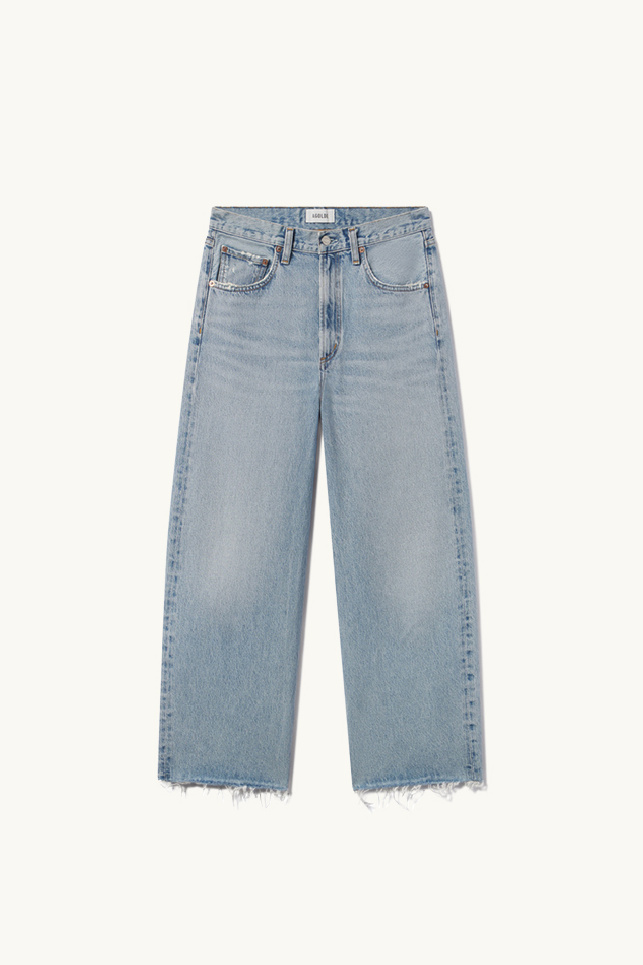 Jean Low Curve Fray, confectionné dans un denim bleu clair à effet marbré, de la marque Agolde.