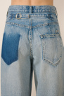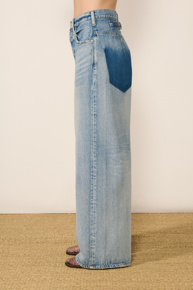 Inspiré du vintage, le jean arbore un bleu délavé et une poche arrière contrastante volontairement décousue.