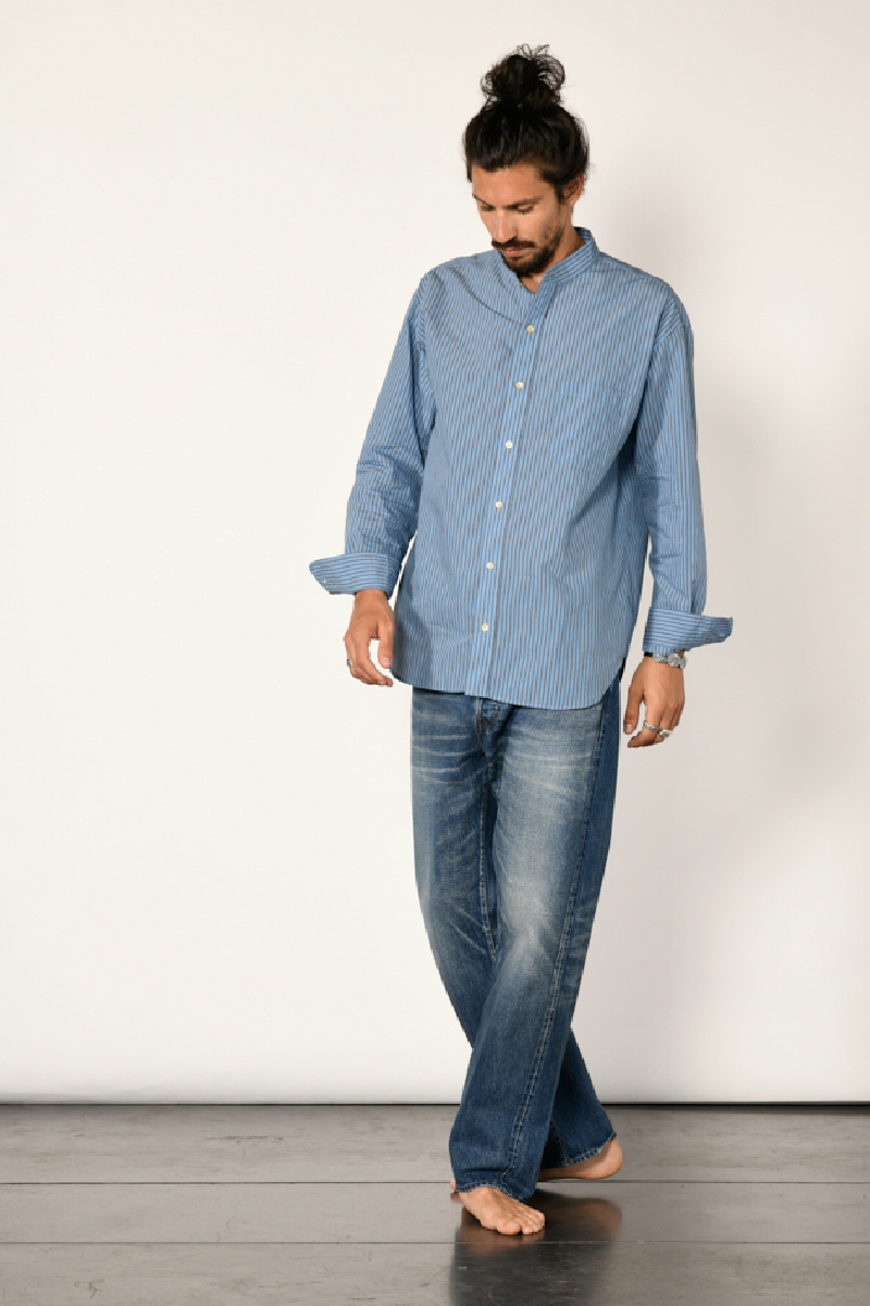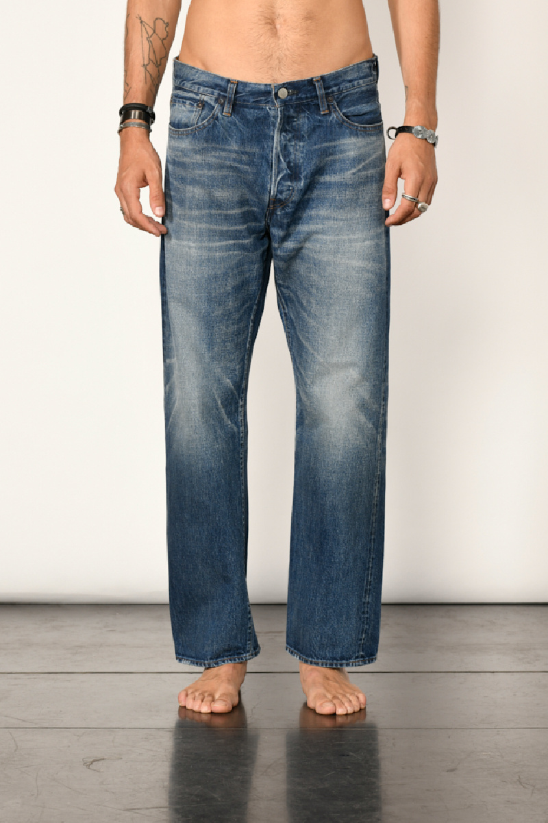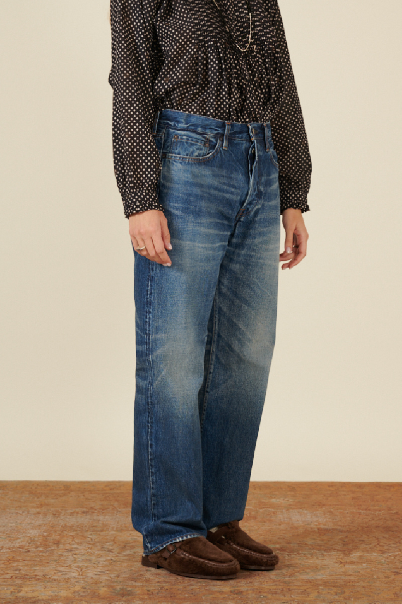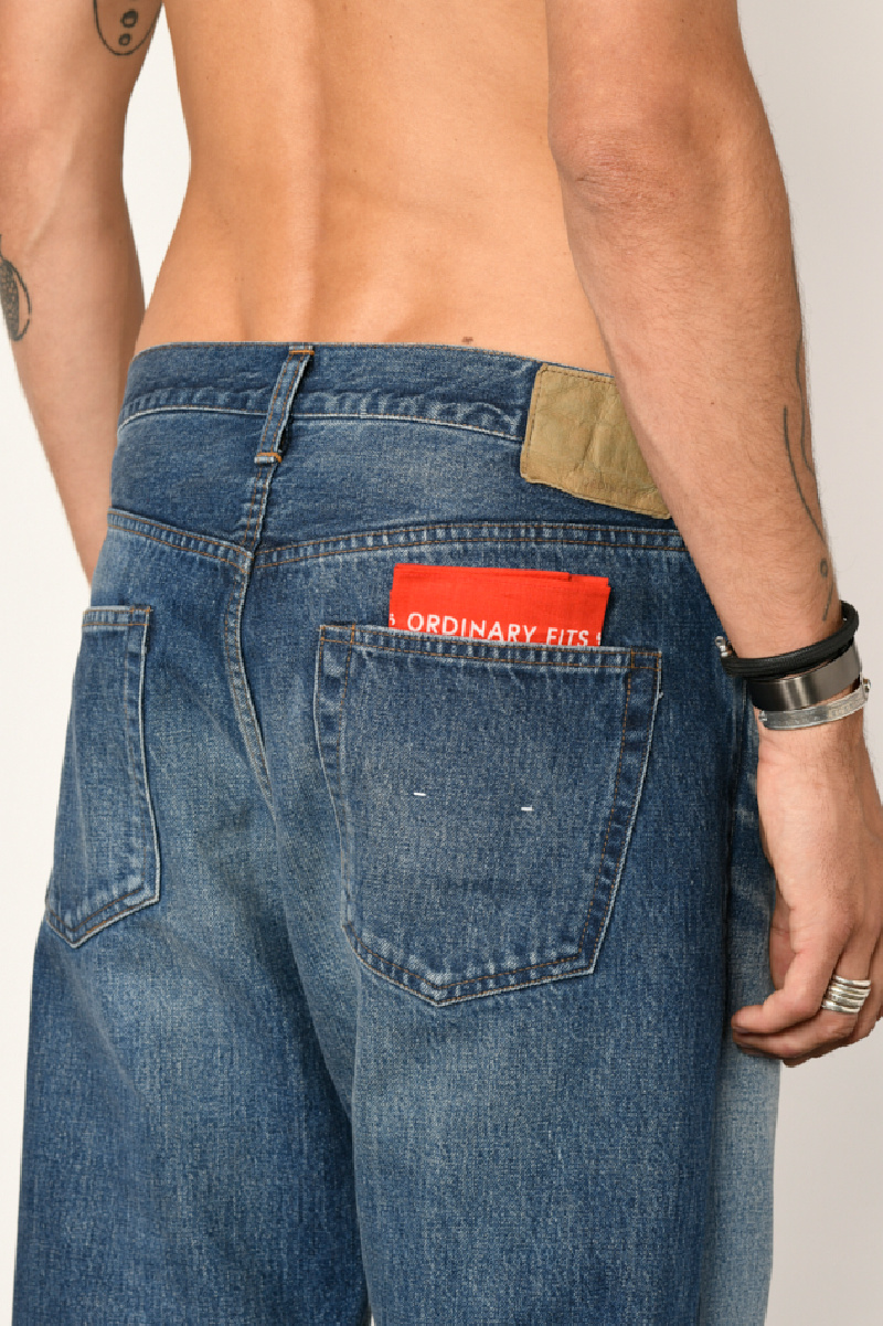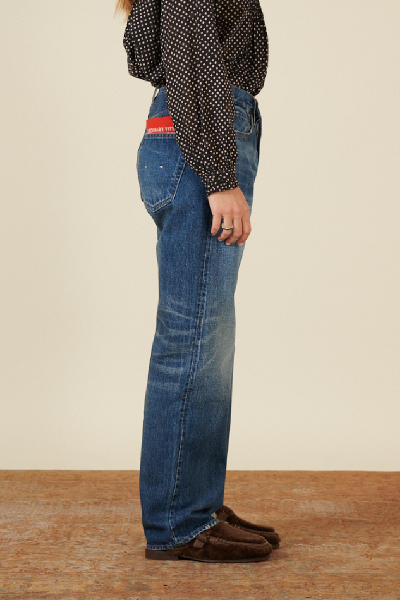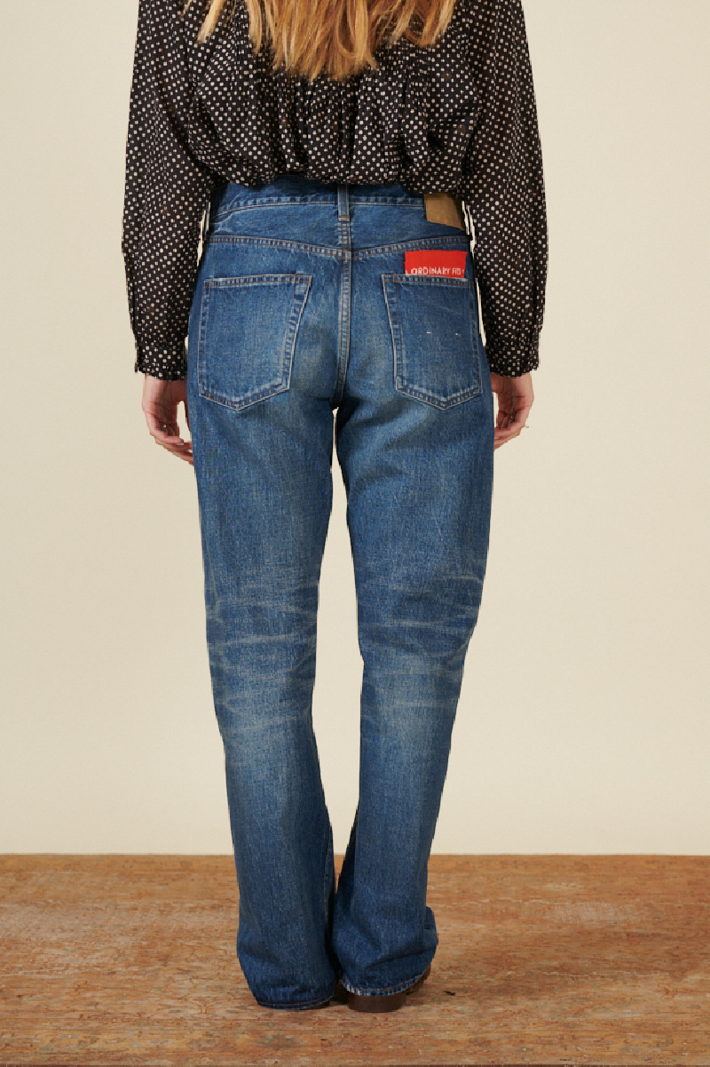 Jean Ordinary Fits en bleu usé, avec une taille mi-haute et une fermeture à boutons à l'avant.