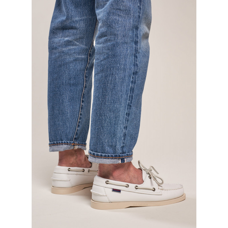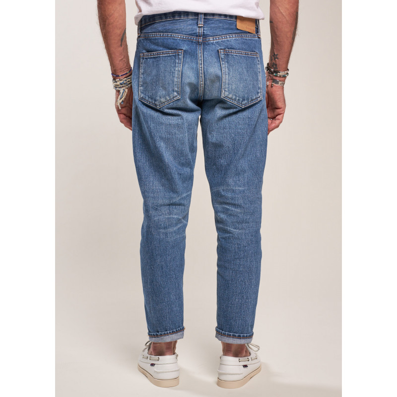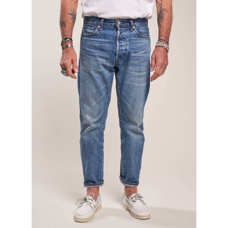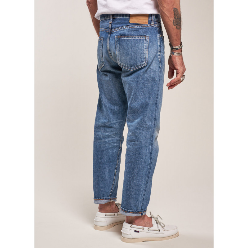 Jean Ordinary Fits, taille mi-haute en denim bleu 3 ans d'âge, coupe droite, cinq poches, fermeture à bouton sous patte, ourlets droits, étiquette en cuir sur l'arrière.