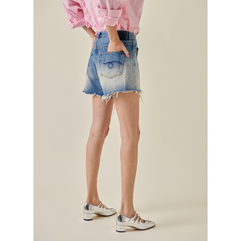 Short R13 en denim bleu, coupe décontractée boyfriend, 5 poches, multiples passants, ceinture décalée, fermeture par bouton, effet usé délavé avec petites tâches, ourlet effiloché.