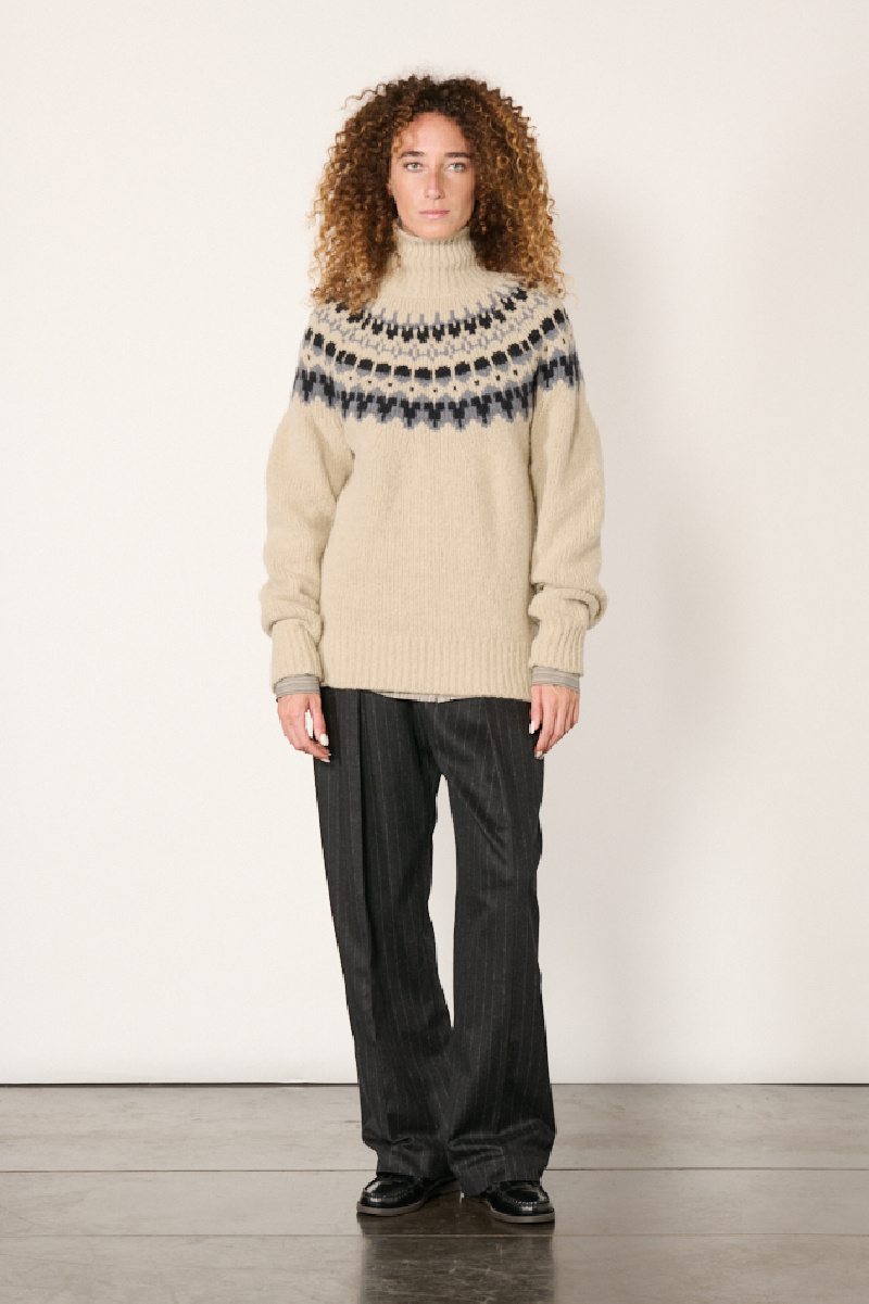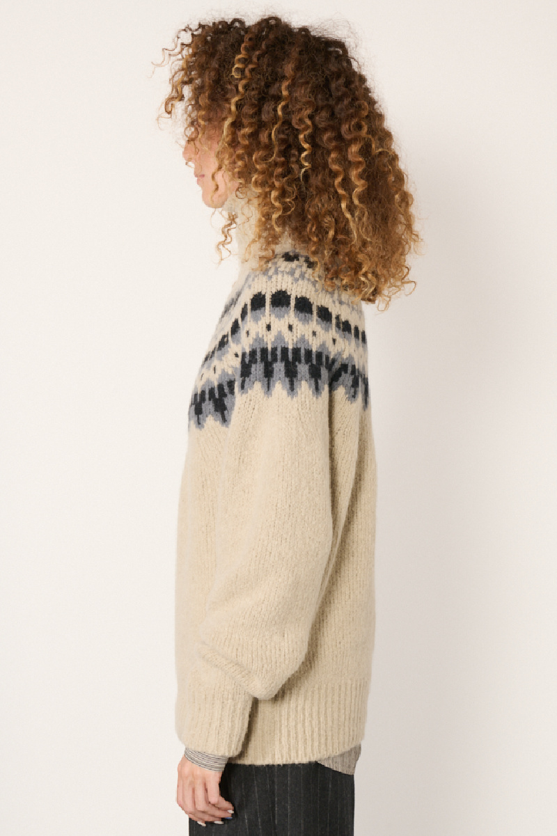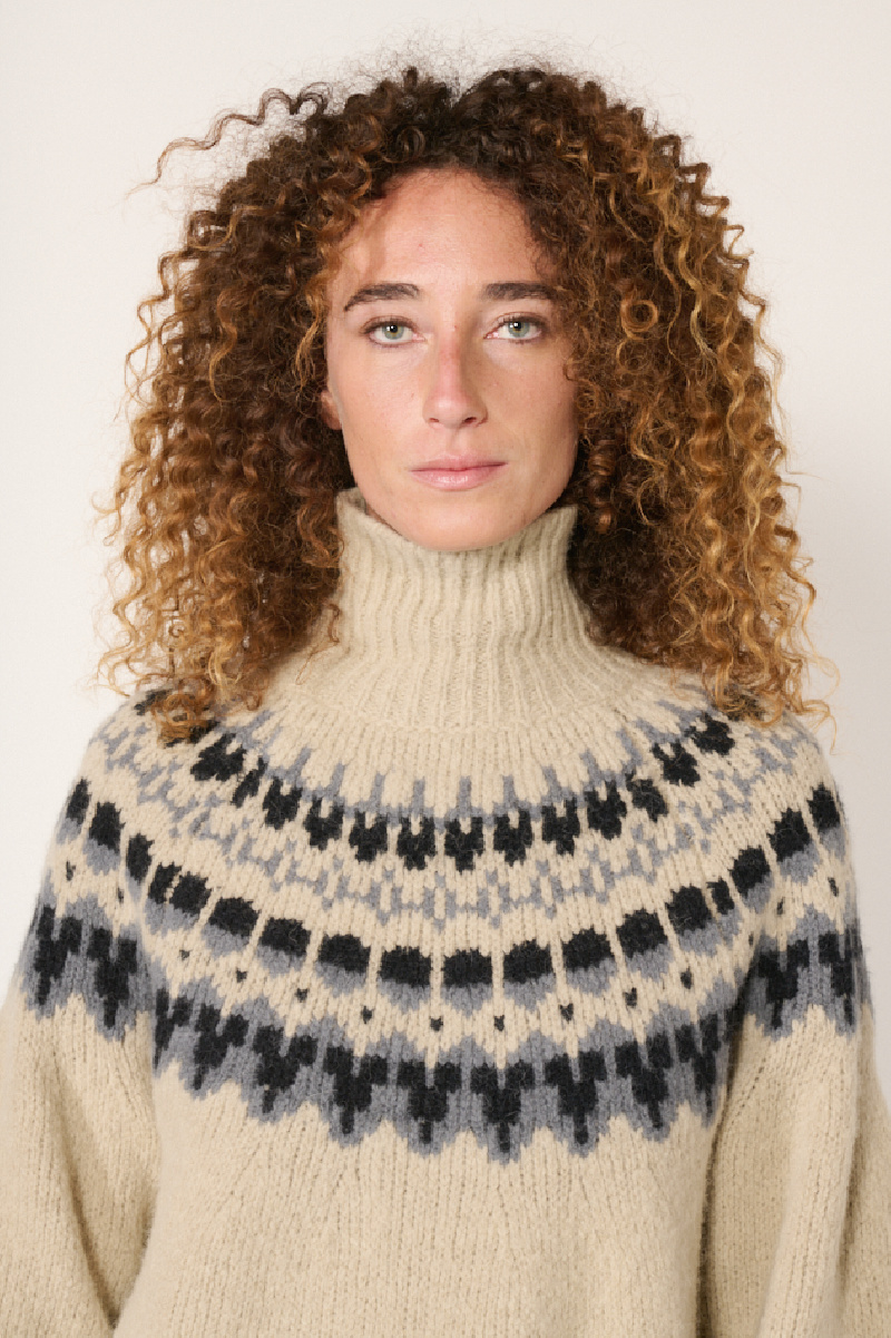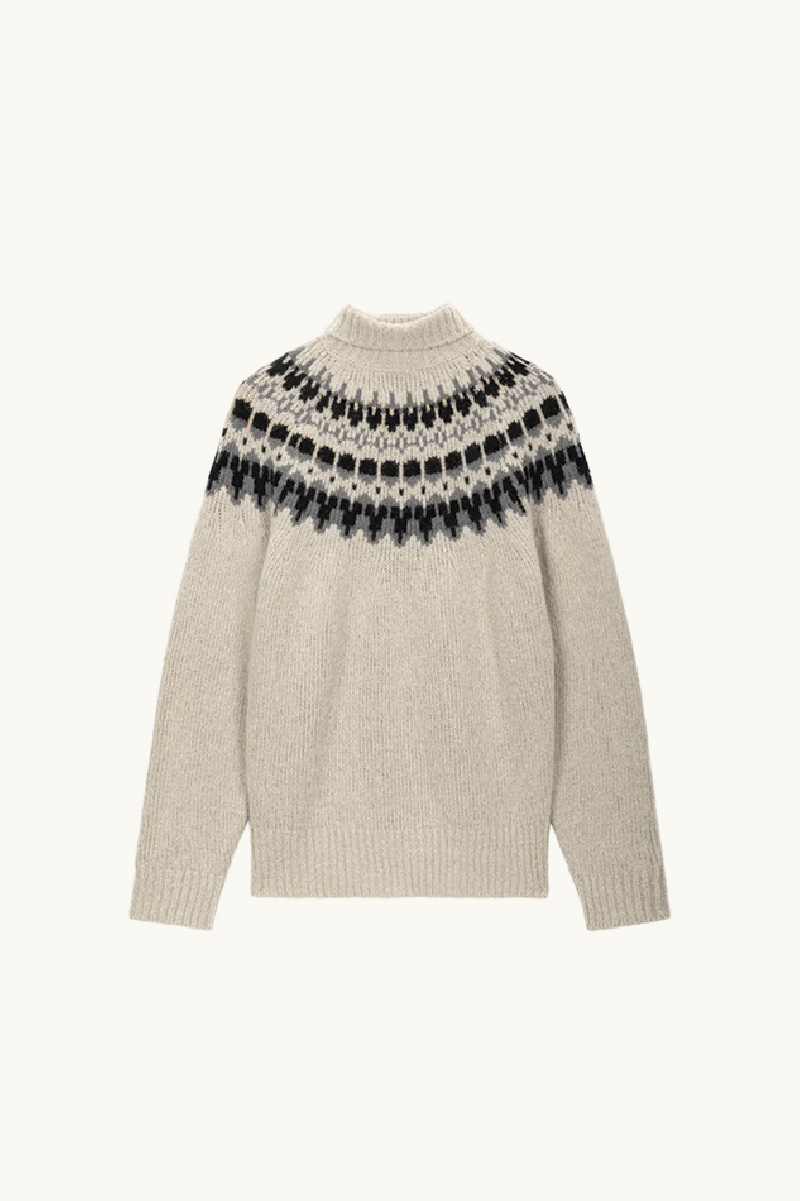 Il présente une coupe décontractée avec un col montant et de longues manches raglan qui assurent confort et modernité. Il se distingue par un motif raffiné aux influences norvégiennes.