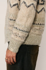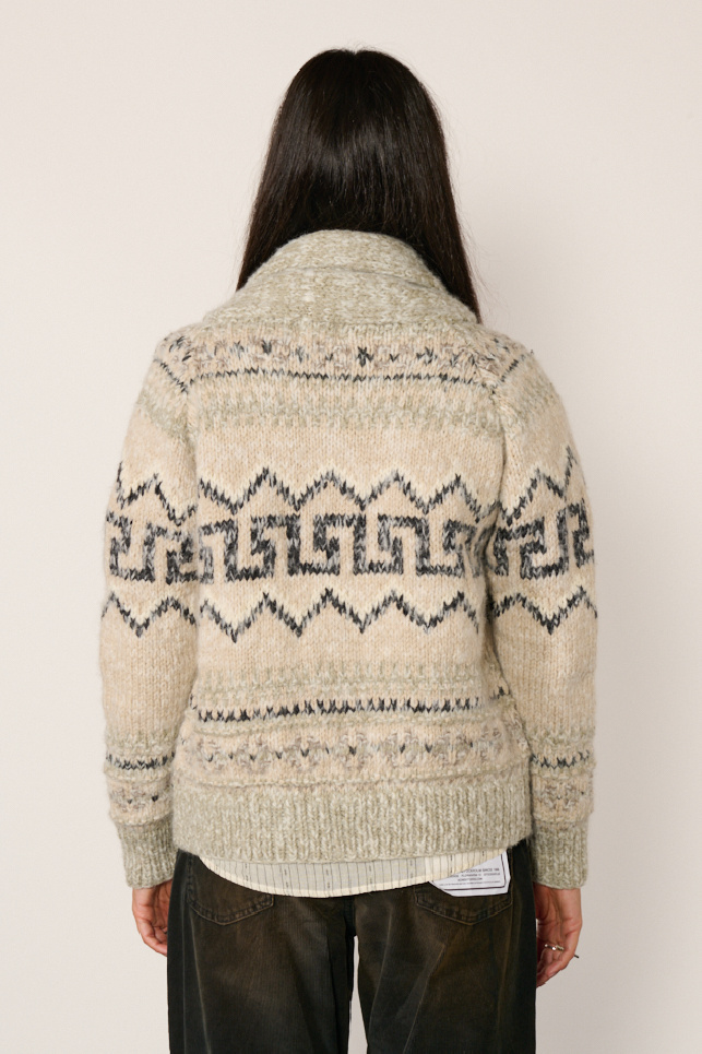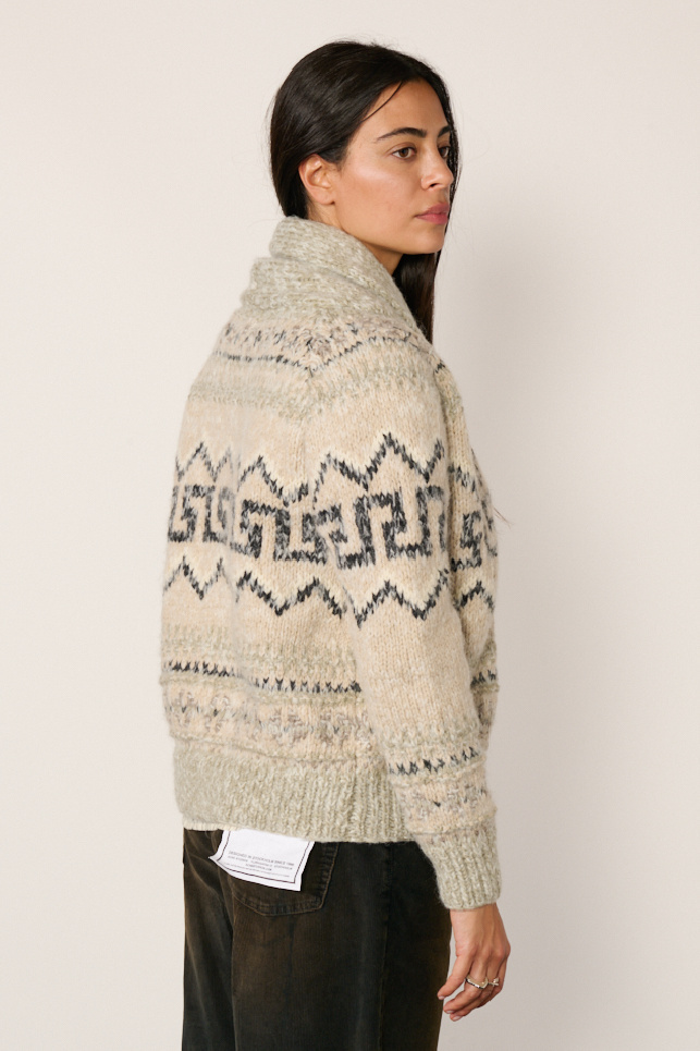 Il offre une coupe ajustée enveloppante avec un motif jacquard Fair Isle, un col châle, une fermeture par mono-bouton sur l’avant et des détails côtelés.