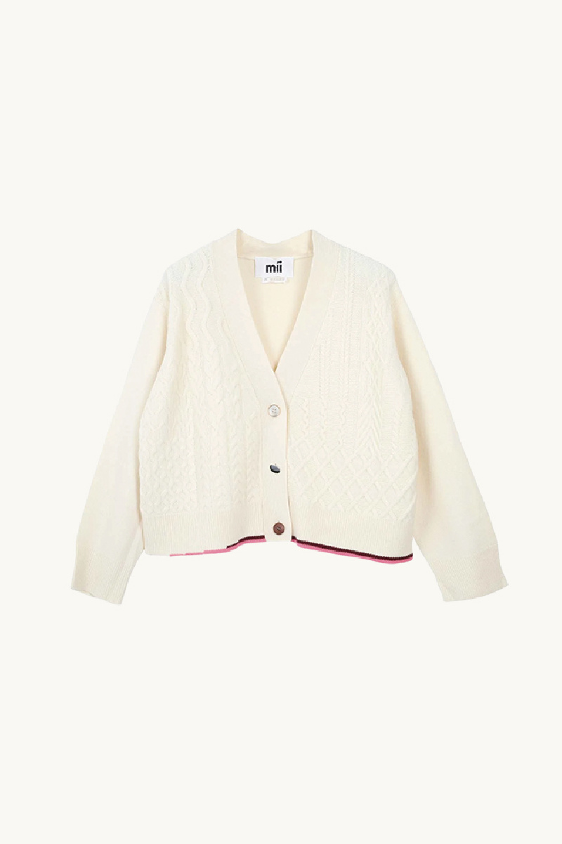 Son design joue avec une variété de points de maille, assemblés de façon harmonieuse et créative, et se complète par de fines bandes rose violacé à la base.