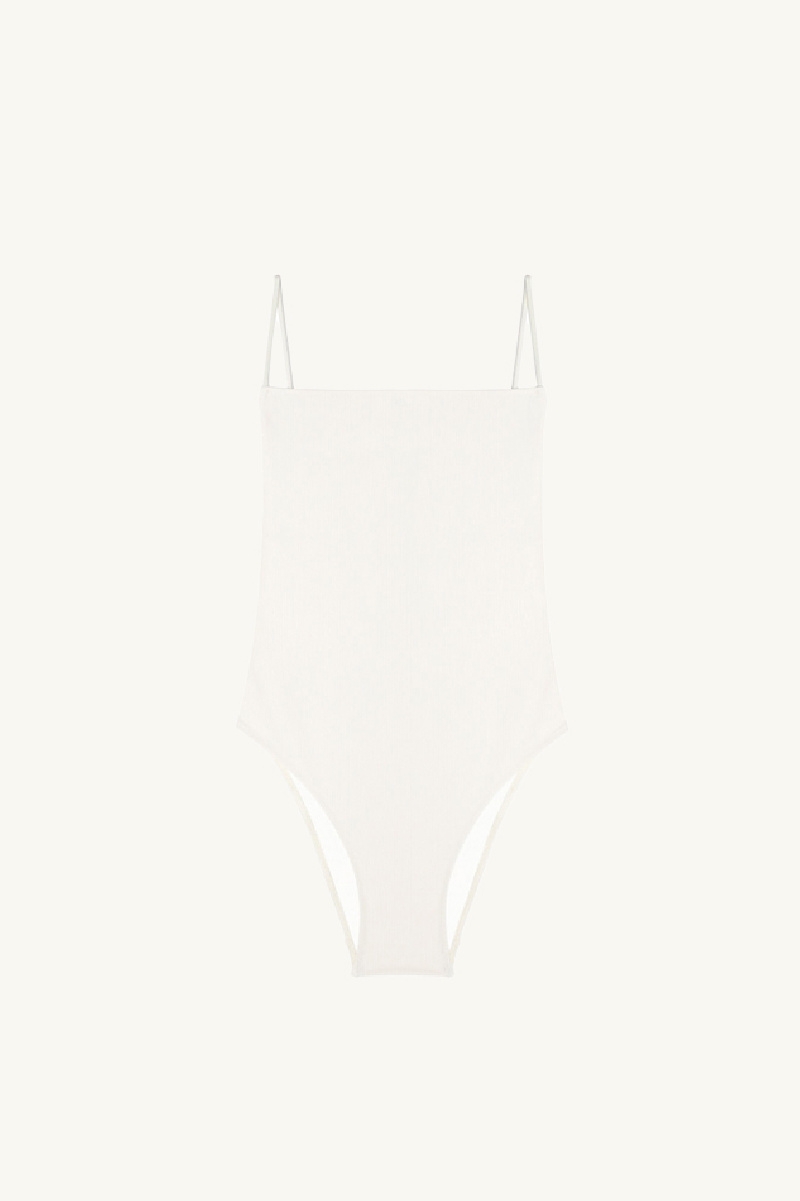 Maillot Lido, couleur blanc ivoire, côtelé, encolure droite, dos nu avec liens à nouer qui permettent d'ajuster la coupe.