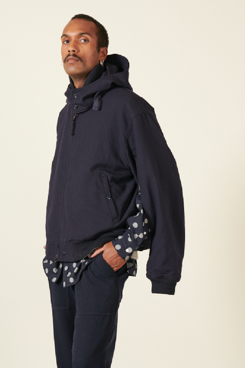 Veste à capuche bleue marine Engineered Garments, avec un col côtelé et une fermeture à glissière sous les avant-bras pour plus de confort. Elle dispose de poches avant intérieures et extérieures à boutons-pression, ainsi qu'une capuche ajustable avec visière, parfaite pour un style fonctionnel.