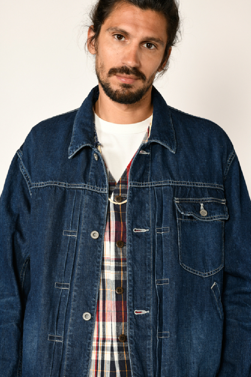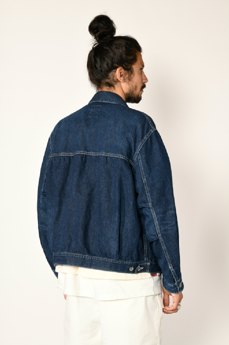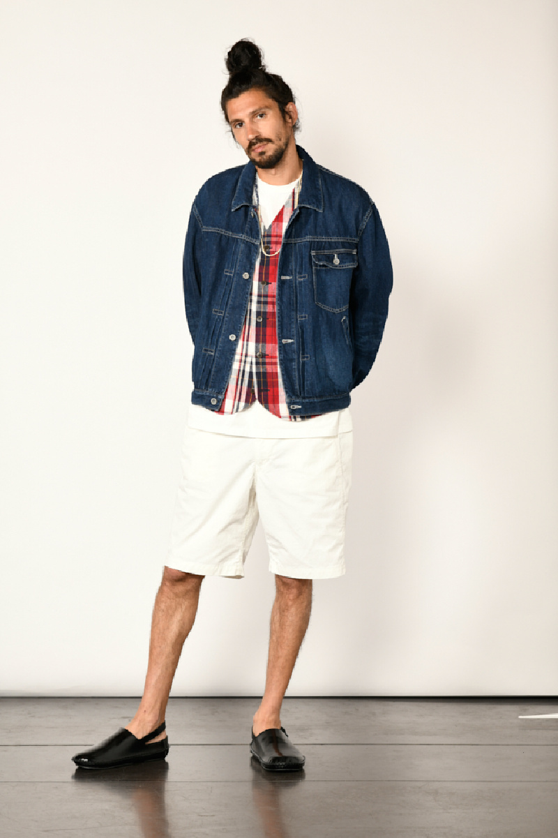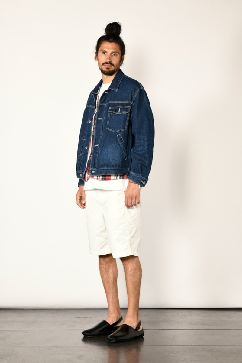 Elle offre une coupe ample raccourcie au niveau des hanches, des épaules arrondies, une fermeture par boutons jeans en métal, une poche plaquée et des poches passepoilées en biais à l’avant, deux pattes de serrage au dos, et de nombreux détails tels que des surpiqures contrastantes et des plis au niveau de la boutonnière.