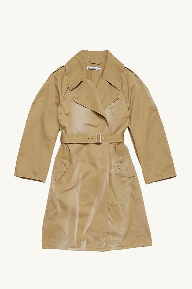 Trench confectionné en sergé de coton biologique beige avec une finition teintée, de la marque Acne Studios.