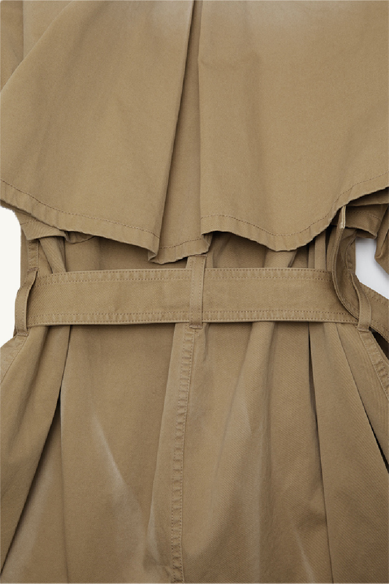 Il offre une coupe droite longueur genou, des épaules descendantes, une fermeture boutonnée, une ceinture amovible, des poignets ceinturés, un rabat au dos avec un patch logo, et une fente arrière.