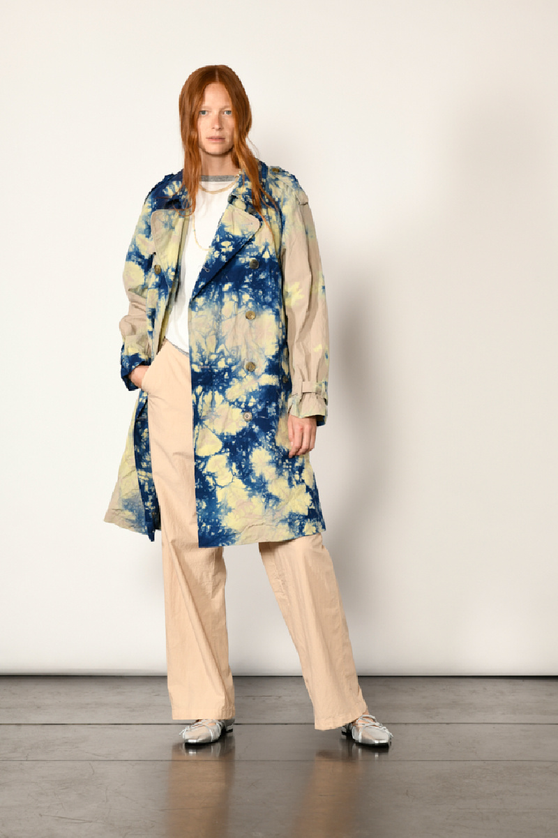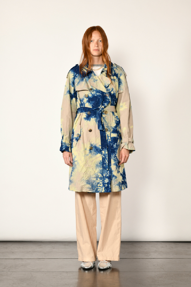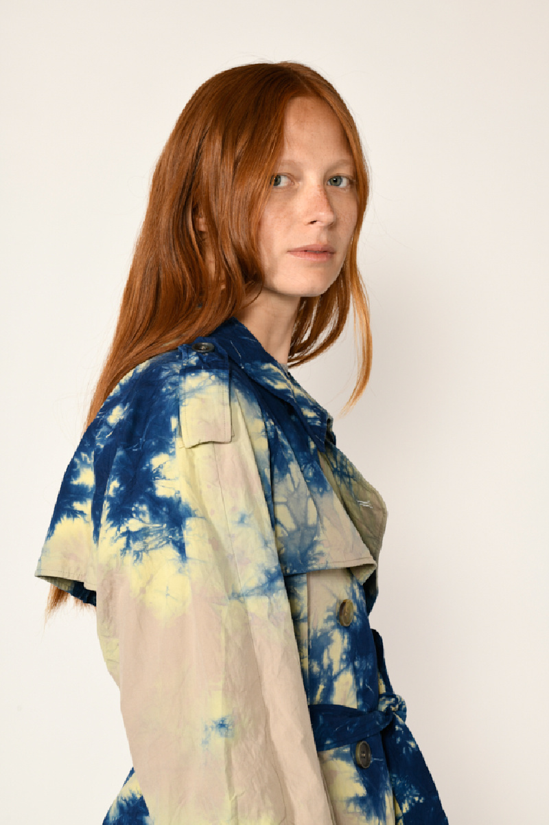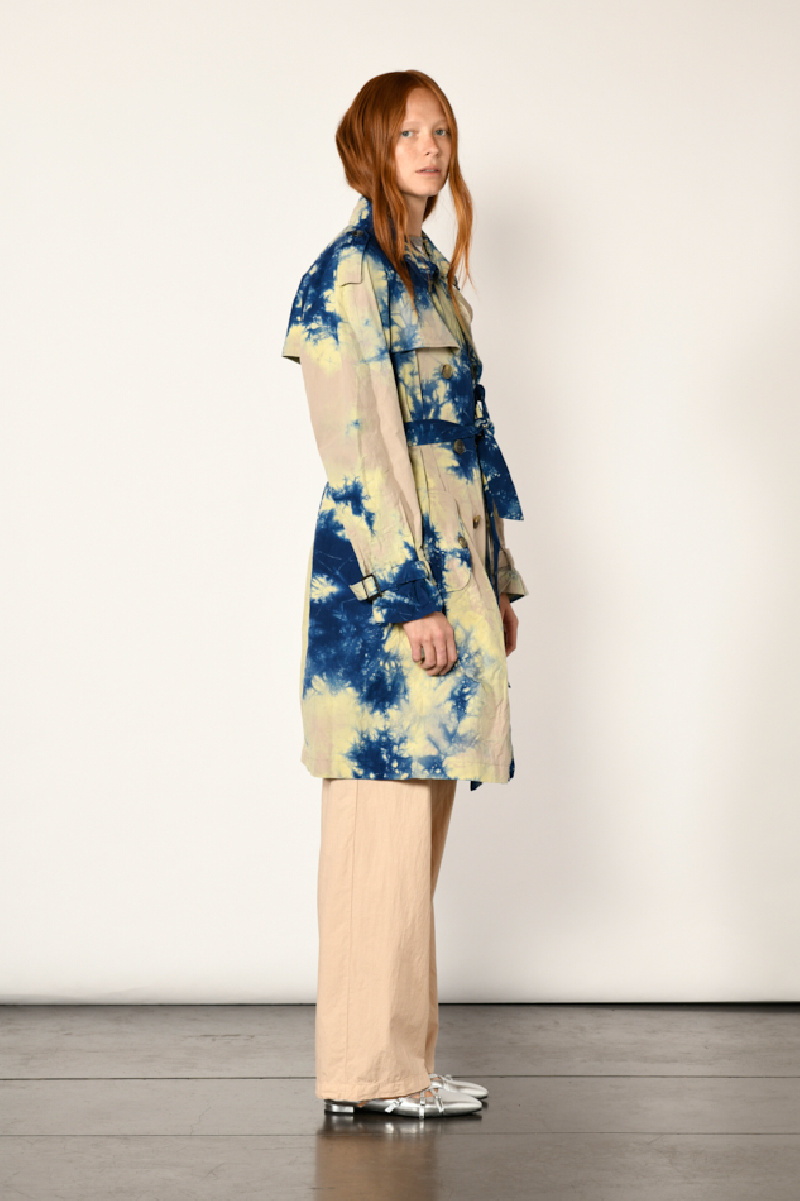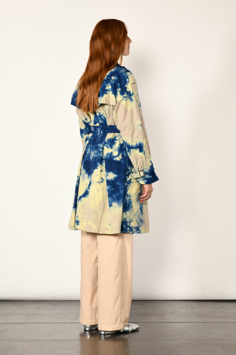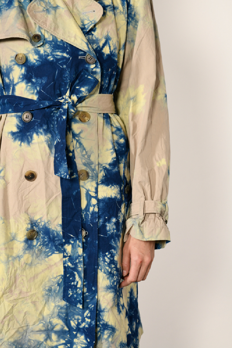 Trench Madara Shibori, confectionné en coton beige et bleu, de la marque Suzusan.