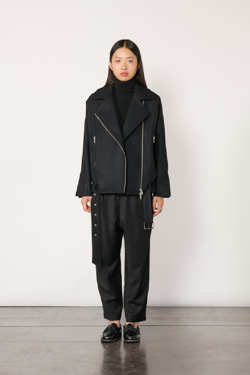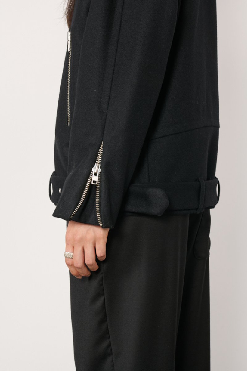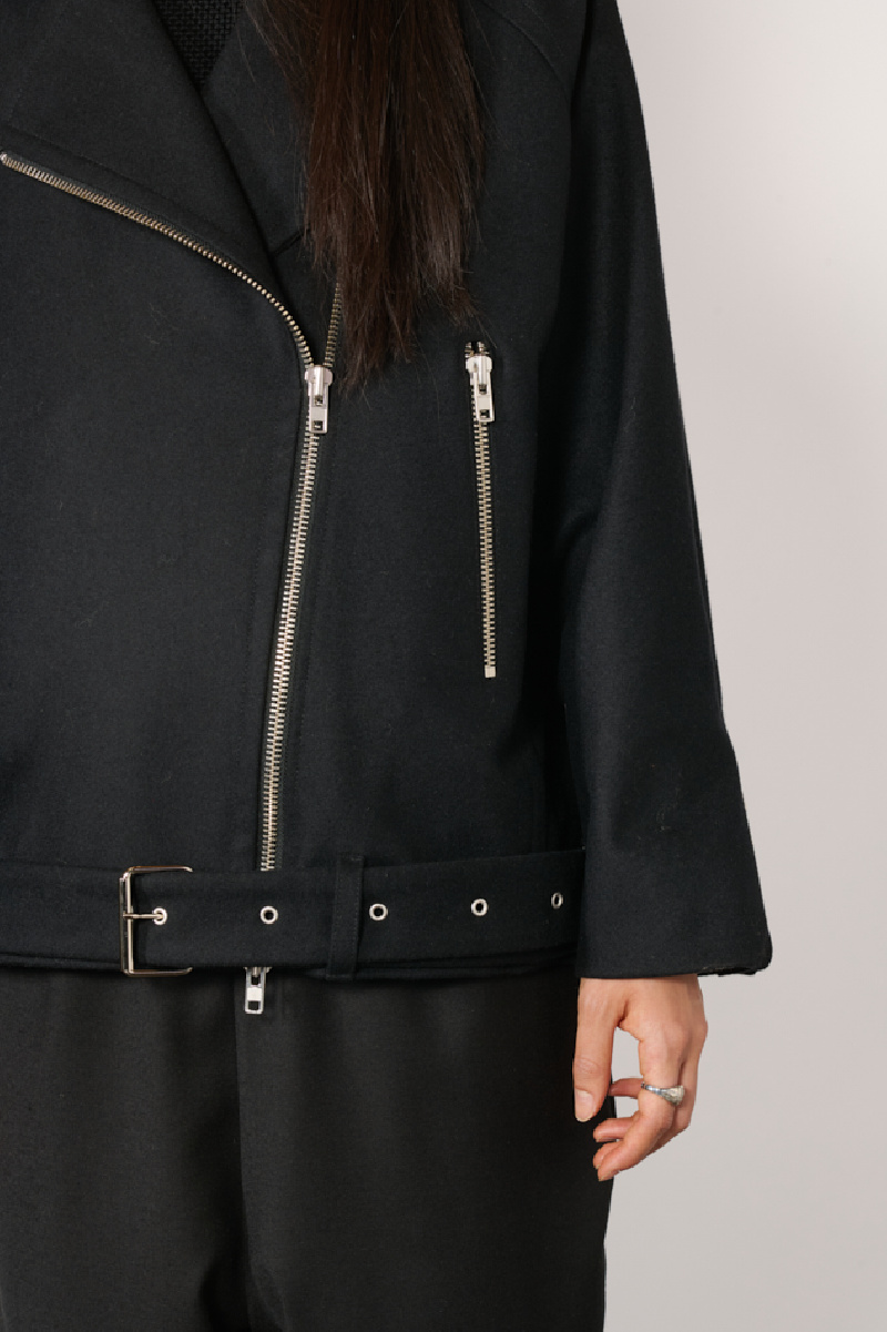 Il offre une coupe courte, une ceinture -avec passants- ajustable à la taille, une fermeture asymétrique par zip métallique argenté, des poches et poignets zippés.