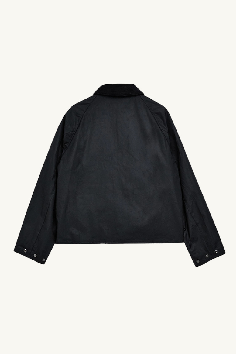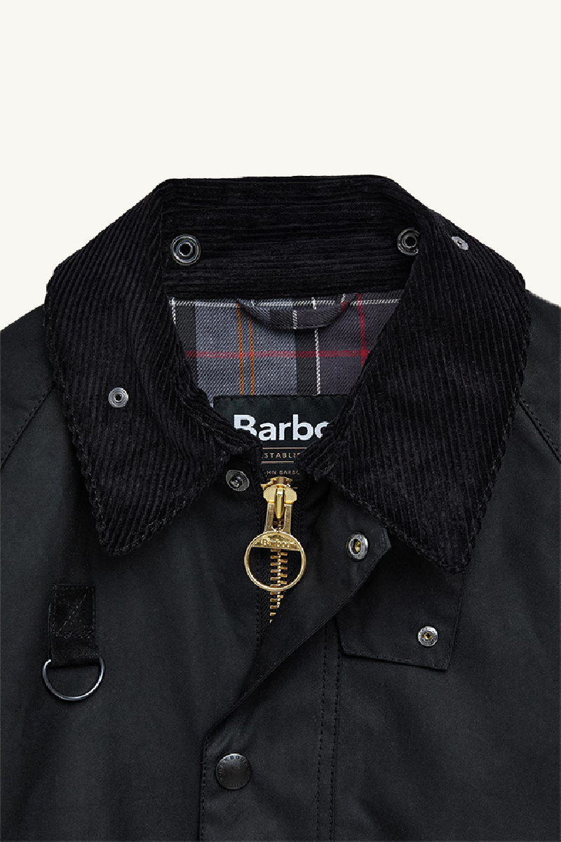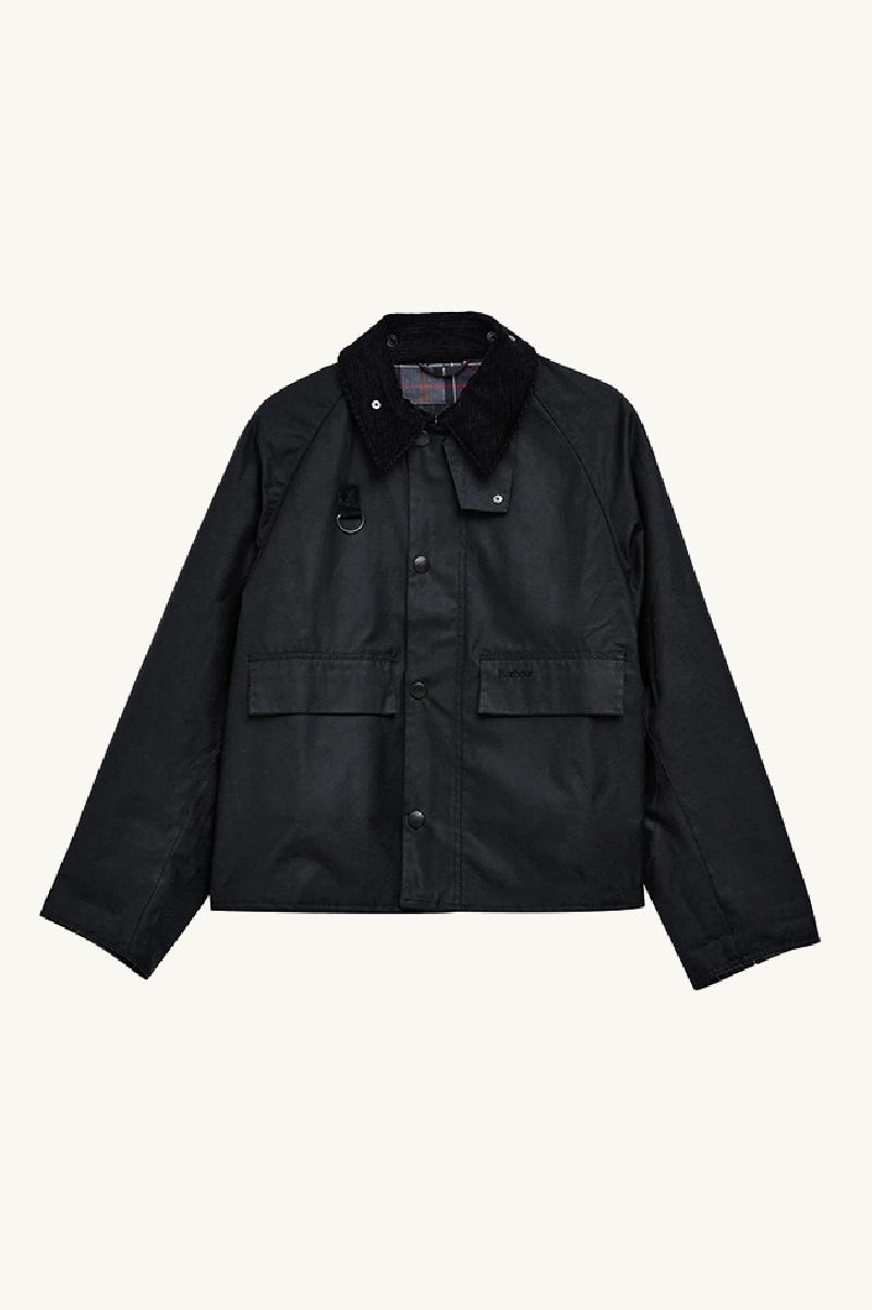 Veste Modified Spey confectionnée dans un coton ciré de 6 oz noir, avec une doublure en coton tartan, de la marque Barbour.