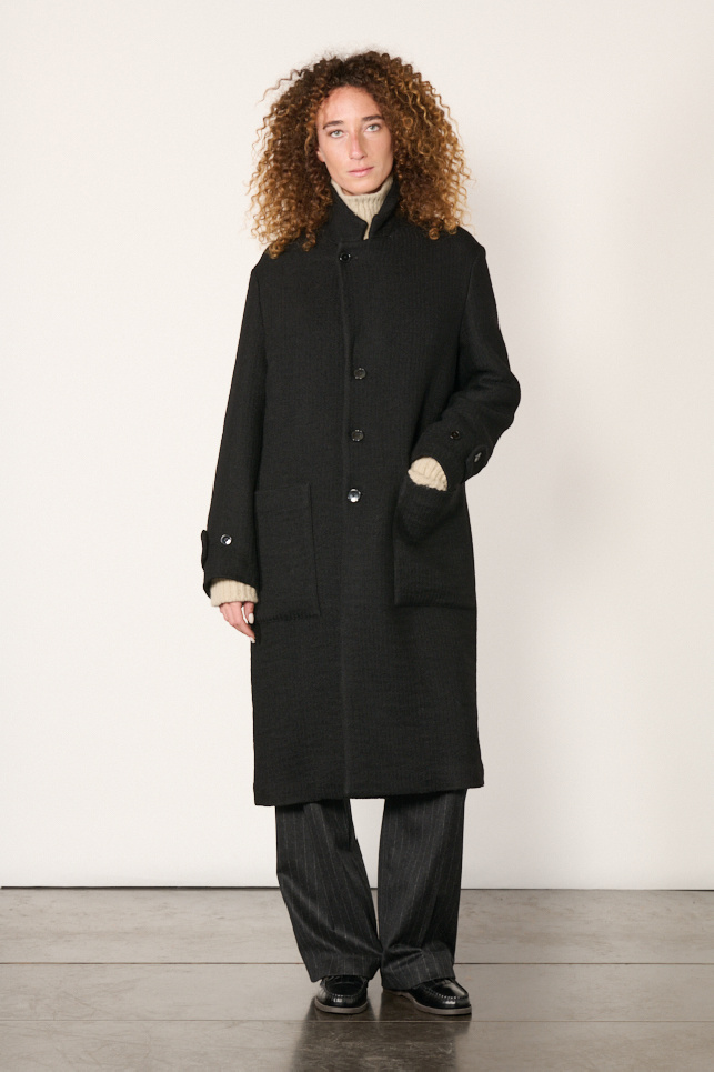 Réalisé en laine douce au tissage tridimensionnel, il dévoile une coupe droite et élégante. Son col peut se porté ouvert ou fermé à l’aide de boutons.