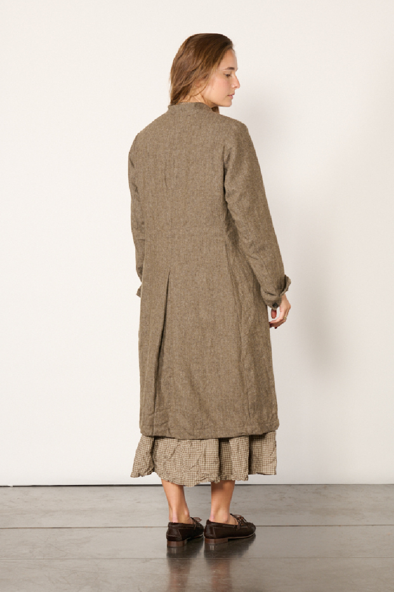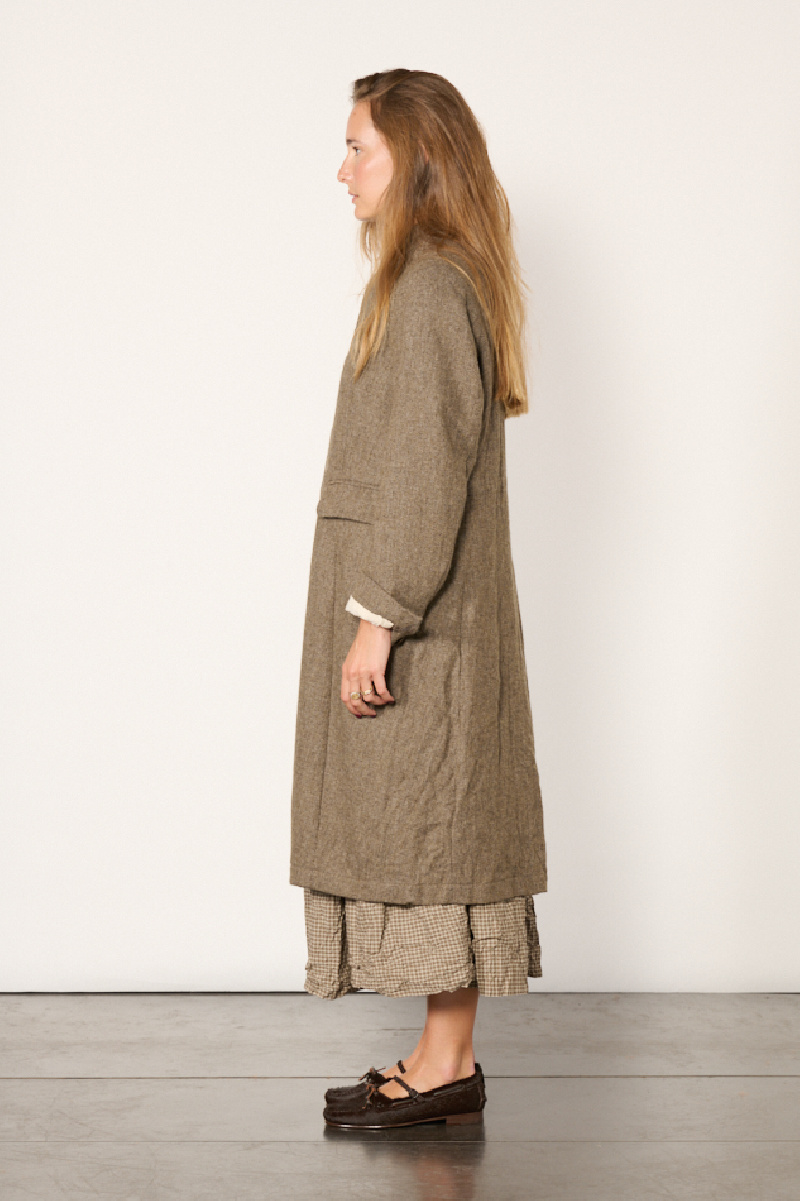 Manteau long confectionné dans un mélange de laine légère éco-responsable avec un motif à chevron marron, entièrement doublé, de la marque Pas de Calais.