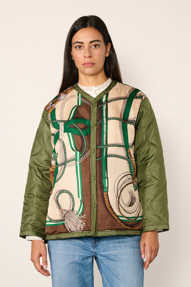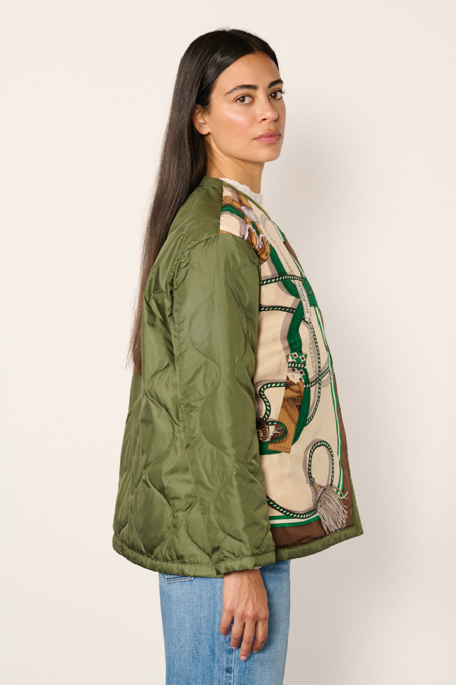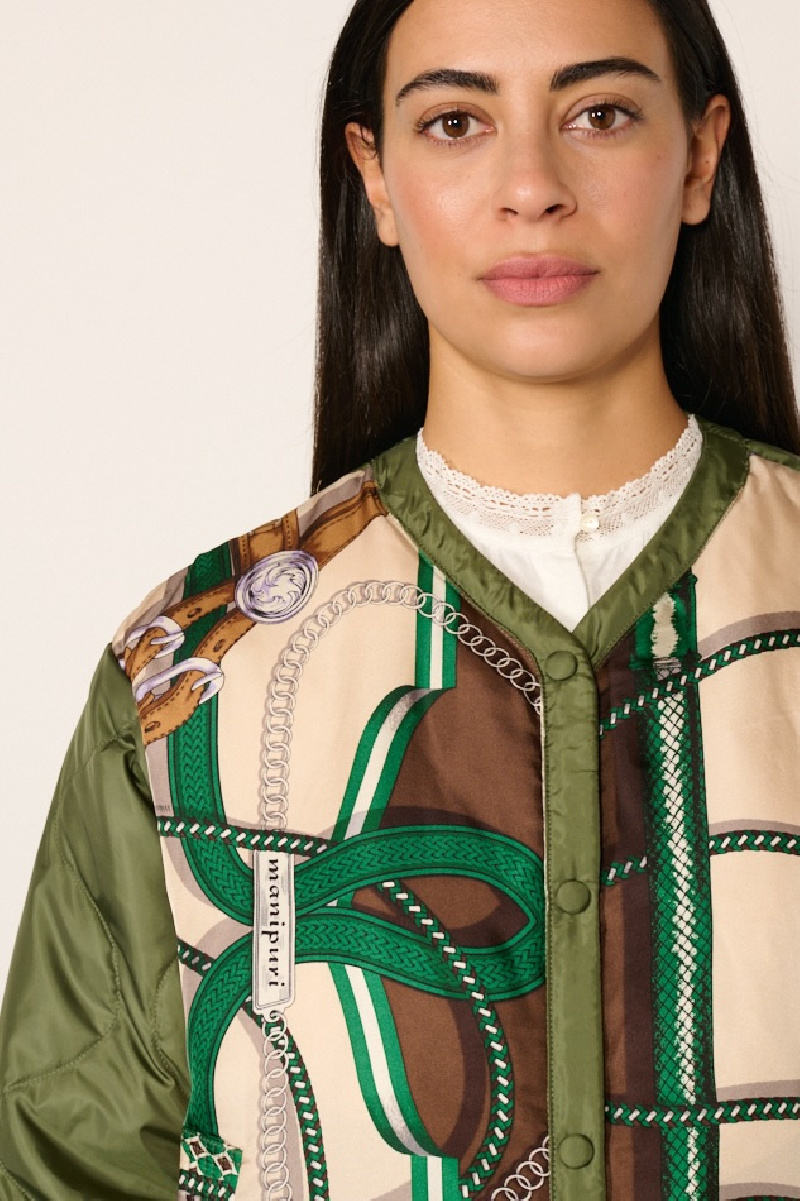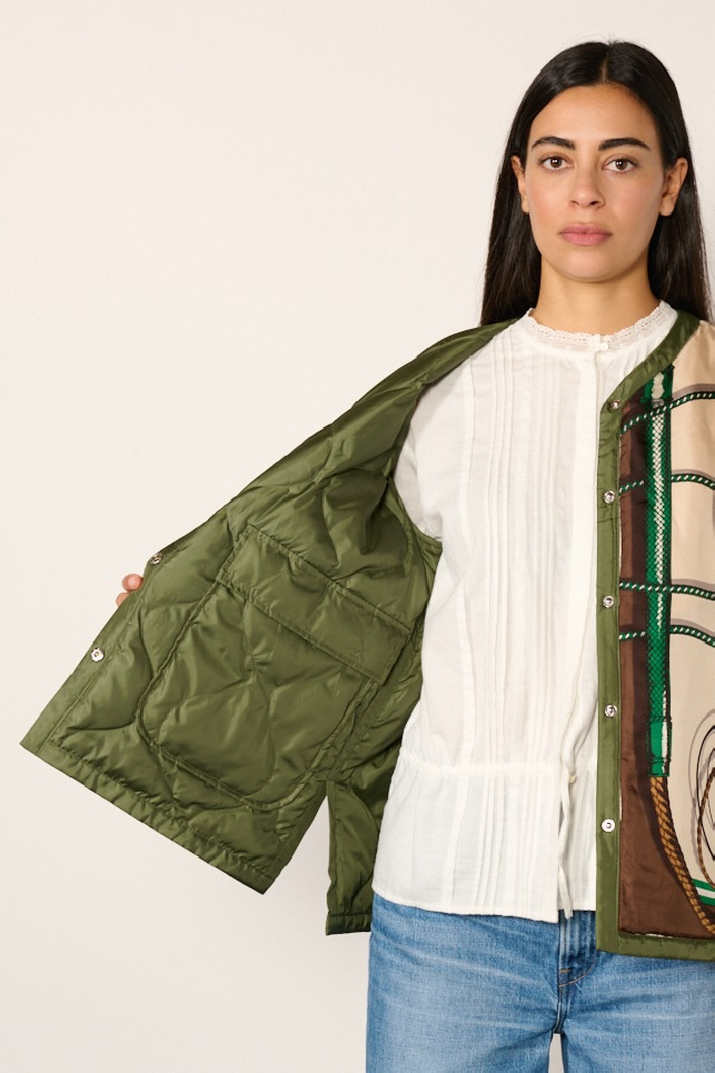 Veste matelassée reversible kaki, rembourrée en duvet et plumes, de la marque Manipuri.