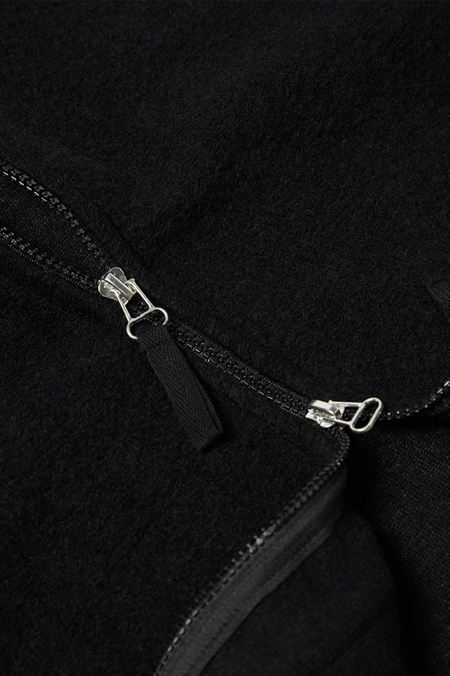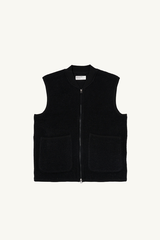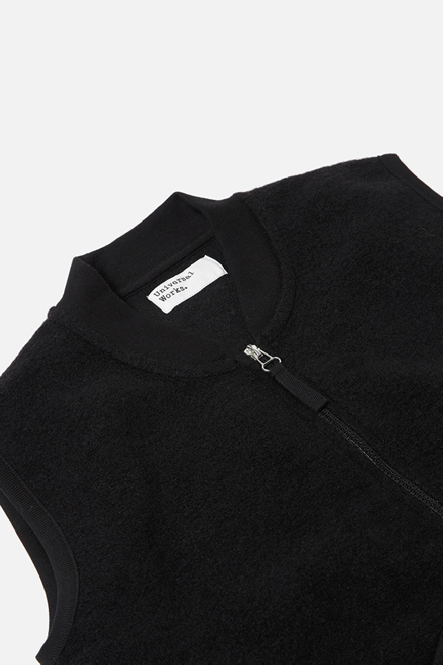 Veste sans manche en laine polaire noire, de la marque Universal Works.
