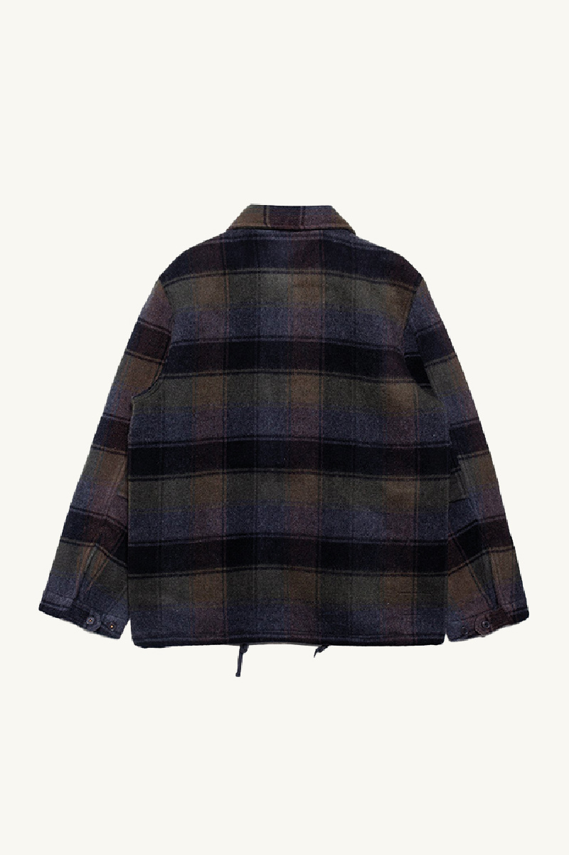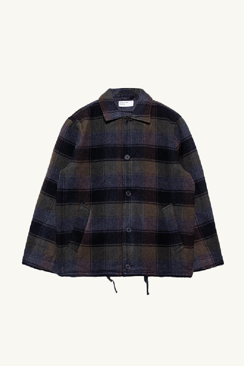 Veste confectionnée en laine brossée à carreaux noirs/marrons/verts/gris, entièrement doublée, de la marque Universal Works.