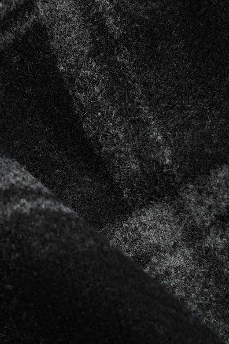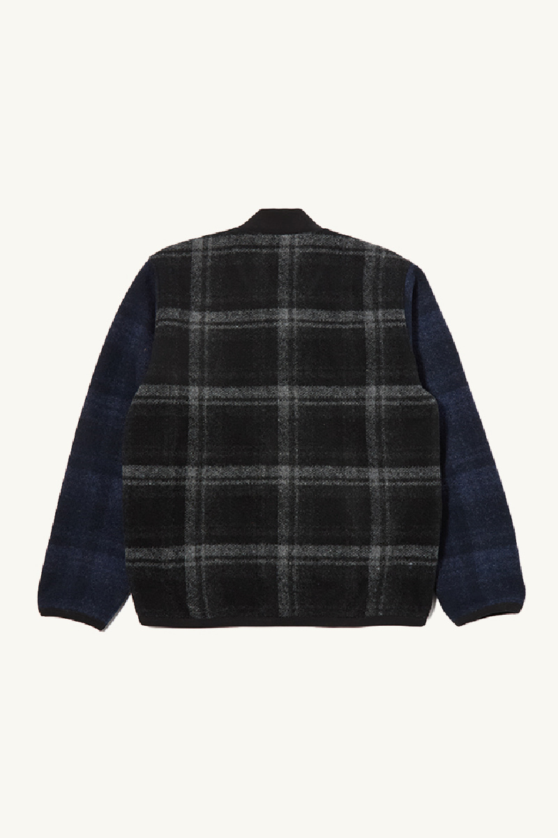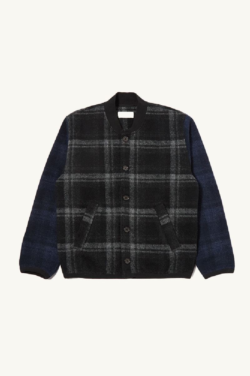 Bomber confectionné en polaire Moh à carreaux, non doublé, dans les tons noir, gris et bleu, de la marque Universal Works.