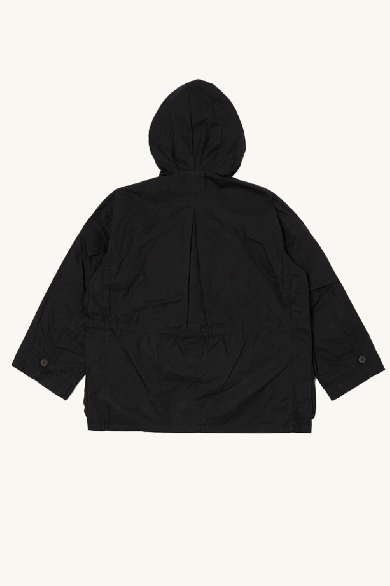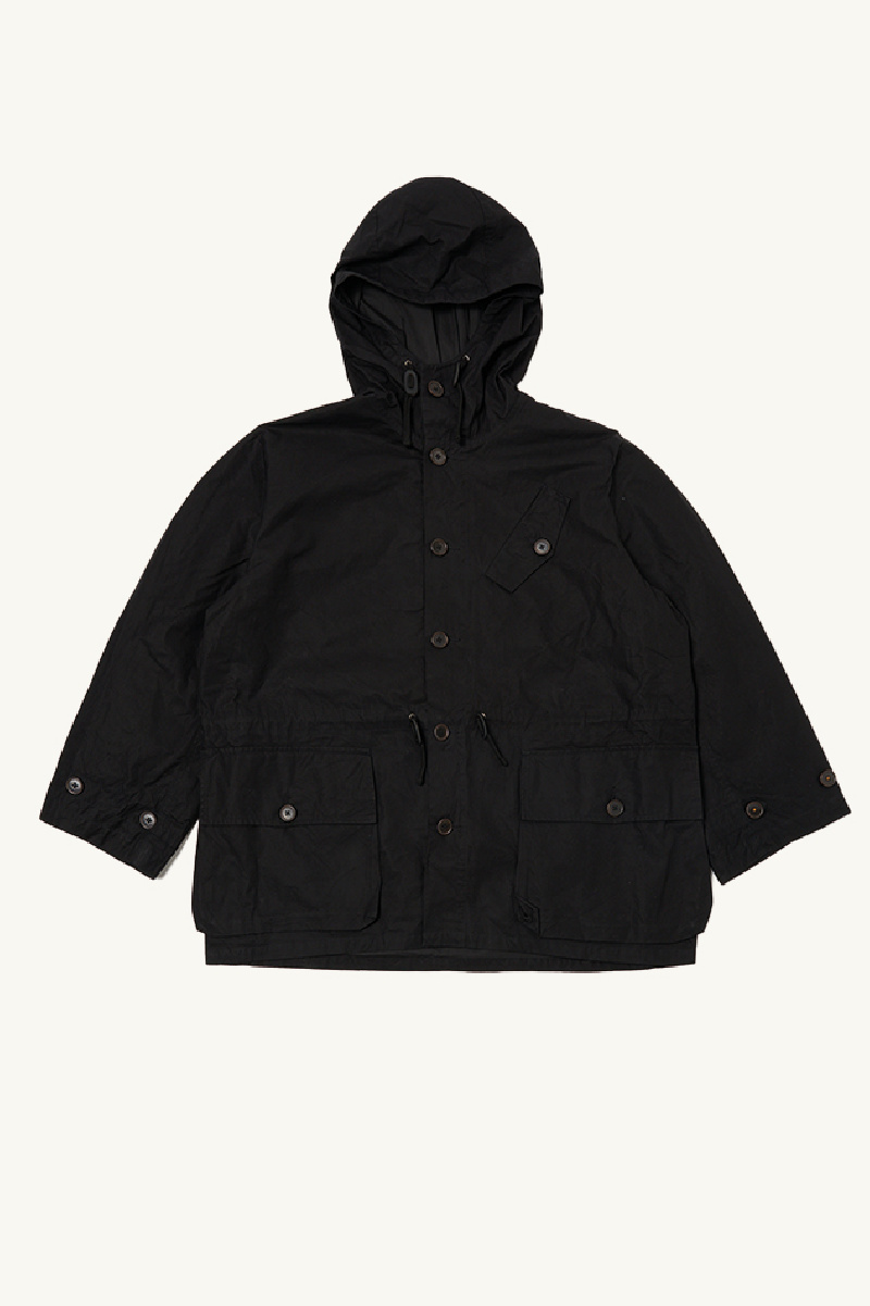Parka légère confectionnée en coton ciré noir, entièrement doublée, de la marque Universal Works.