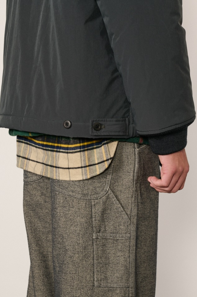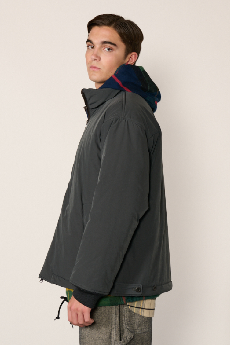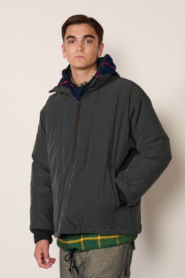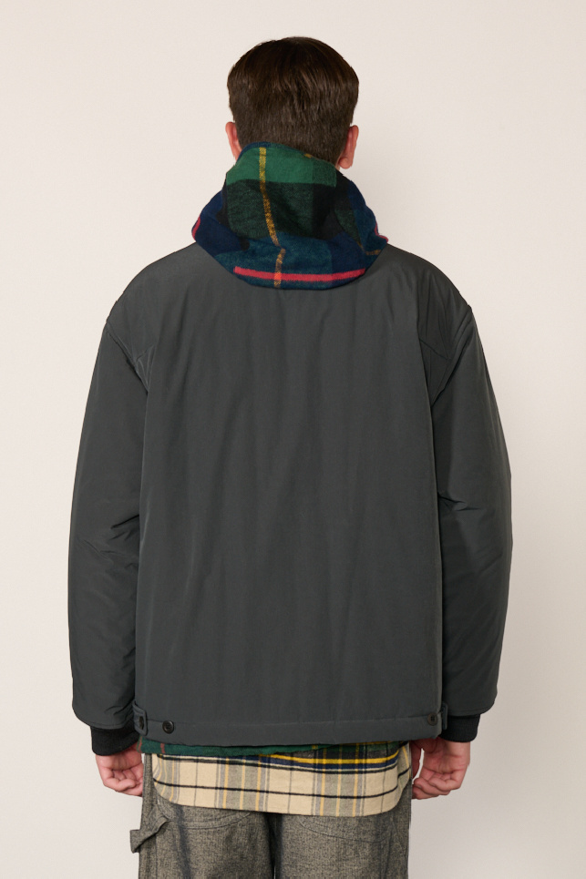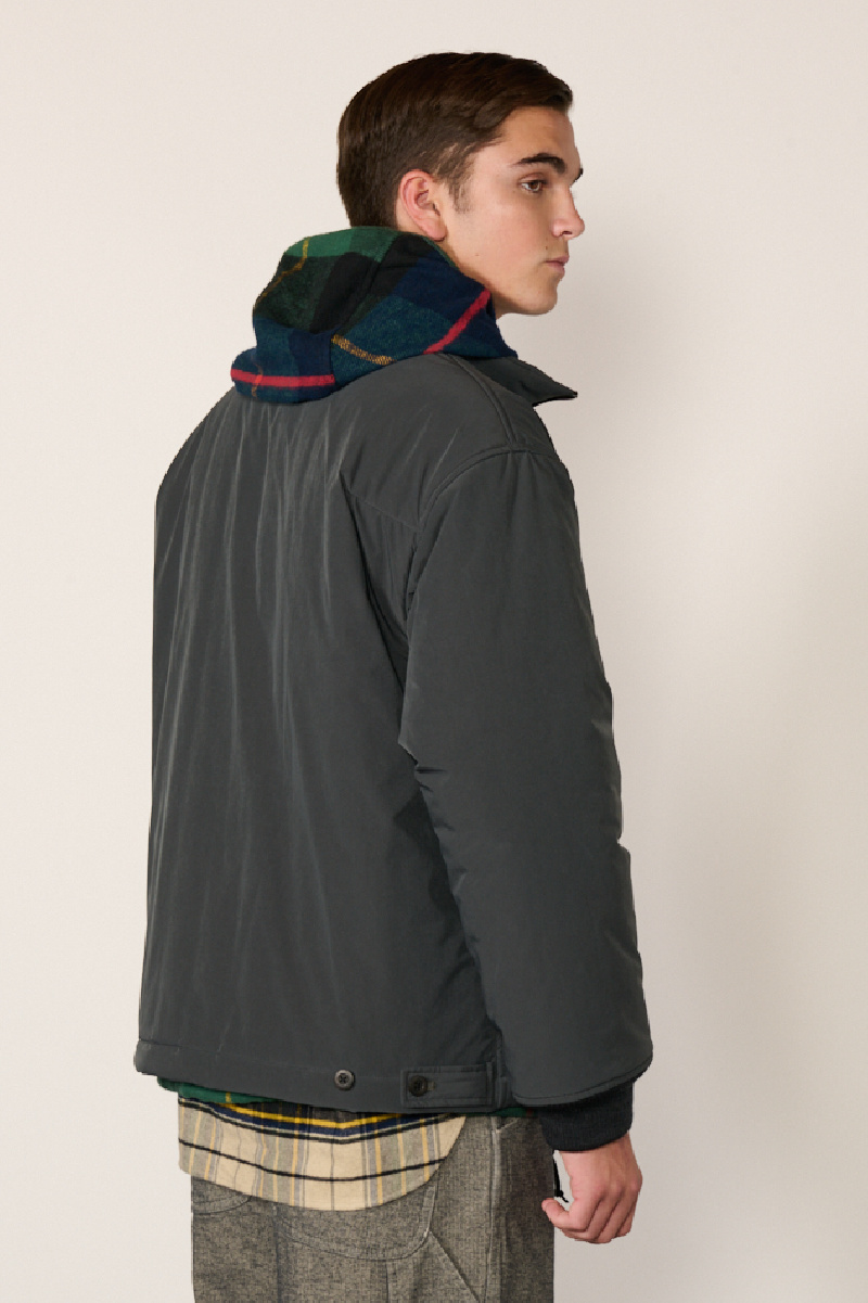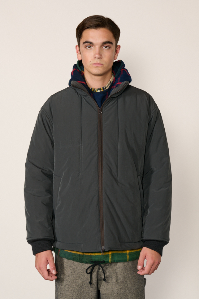 Blouson rembourré de la marque TS(s) confectionnée en mélange de polyester et nylon SOLOTEX extensible à l’effet peau de pêche, coloris Charcoal.