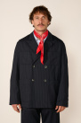 Partiellement doublée, elle dispose de quatre poches plaquées, d’une fermeture croisée boutonnée et d’une fente simple au dos.