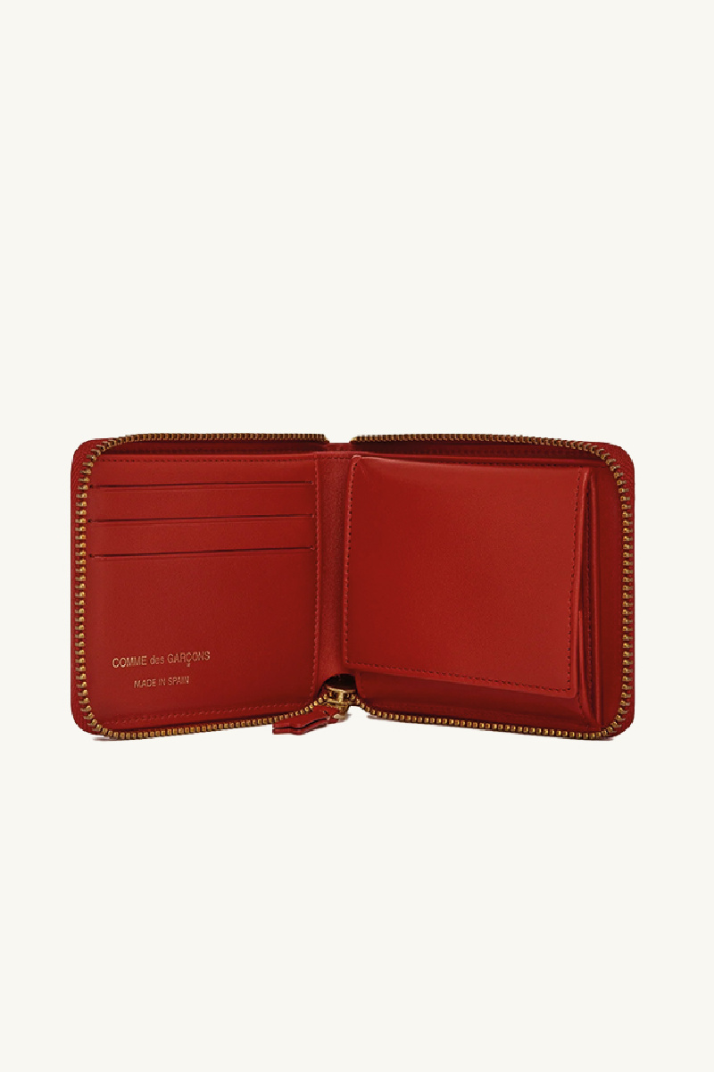 Portefeuille en cuir de veau à pois rouge et blanc Comme des Garçons. Fermeture zippée, compartiment porte-cartes trois encoches et rangement pièces avec fermeture boutonnée.