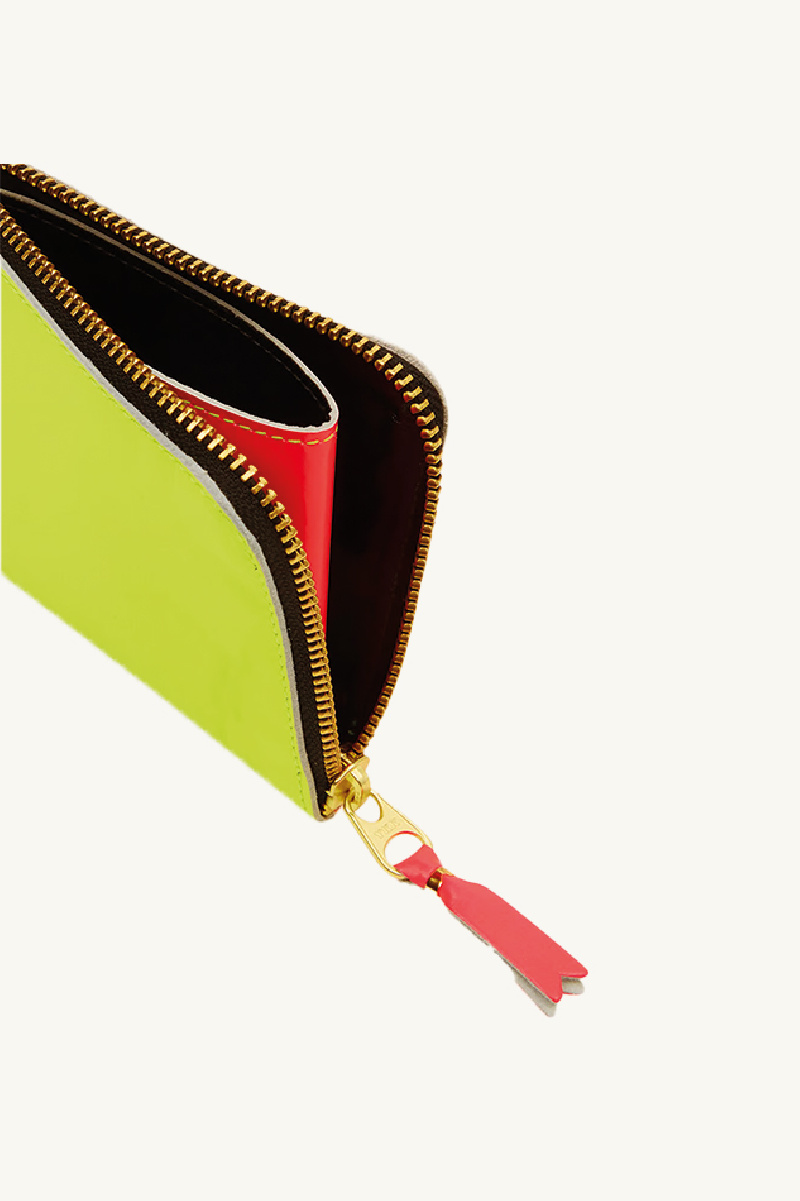 Petit portefeuille de la marque Comme des Garçons, en cuir de chèvre, de couleurs fluo : jaune et orange à l'extérieur, rose à l'intérieur.