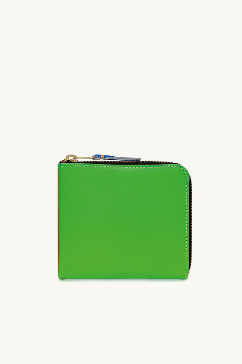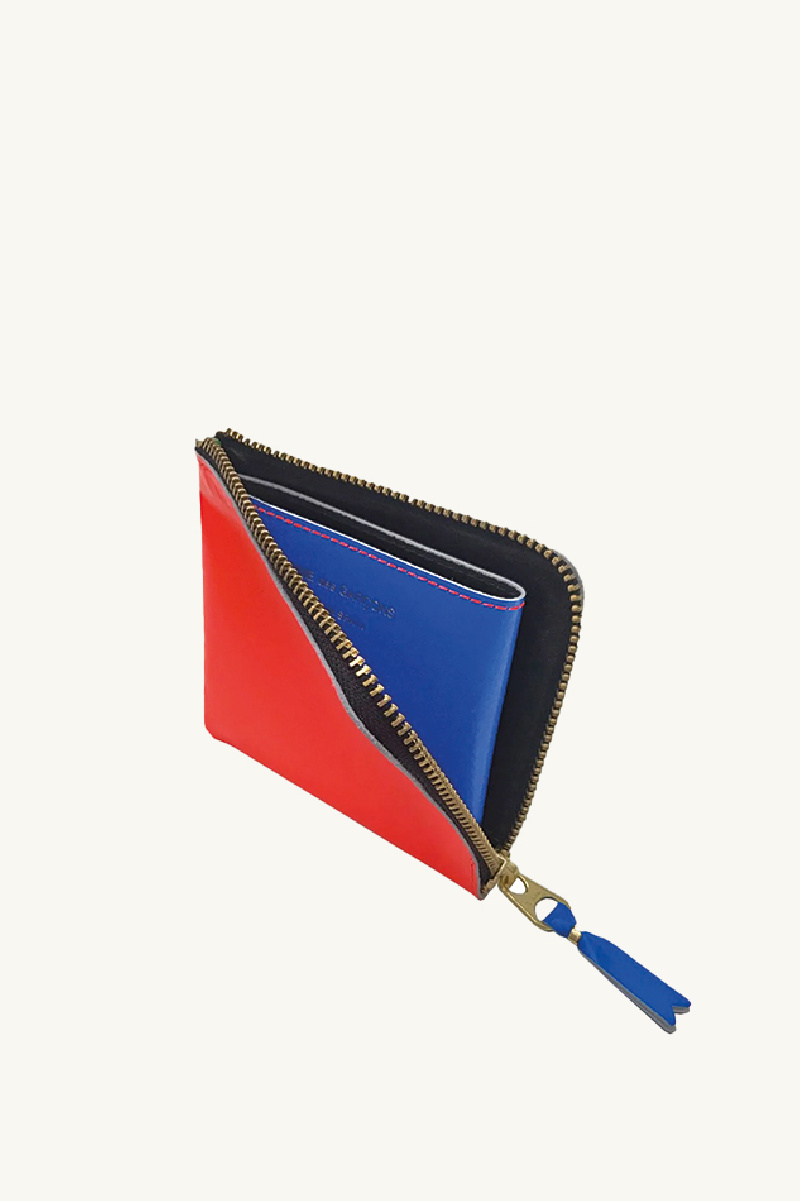 Petit portefeuille de la marque Comme des Garçons, en cuir de chèvre, de couleurs fluo : orange et vert à l'extérieur, bleu à l'intérieur.