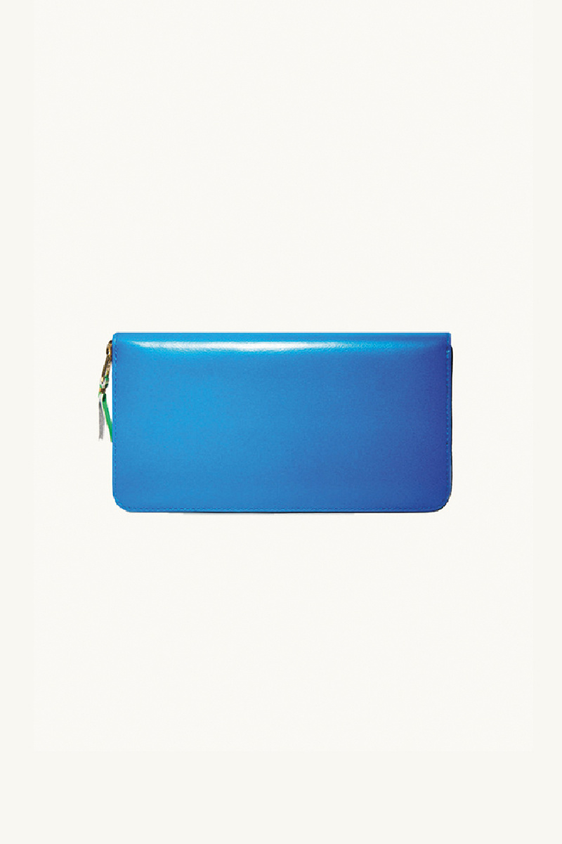 Portefeuille de la marque Comme Des Garçons confectionné en cuir de chèvre lisse bleu.