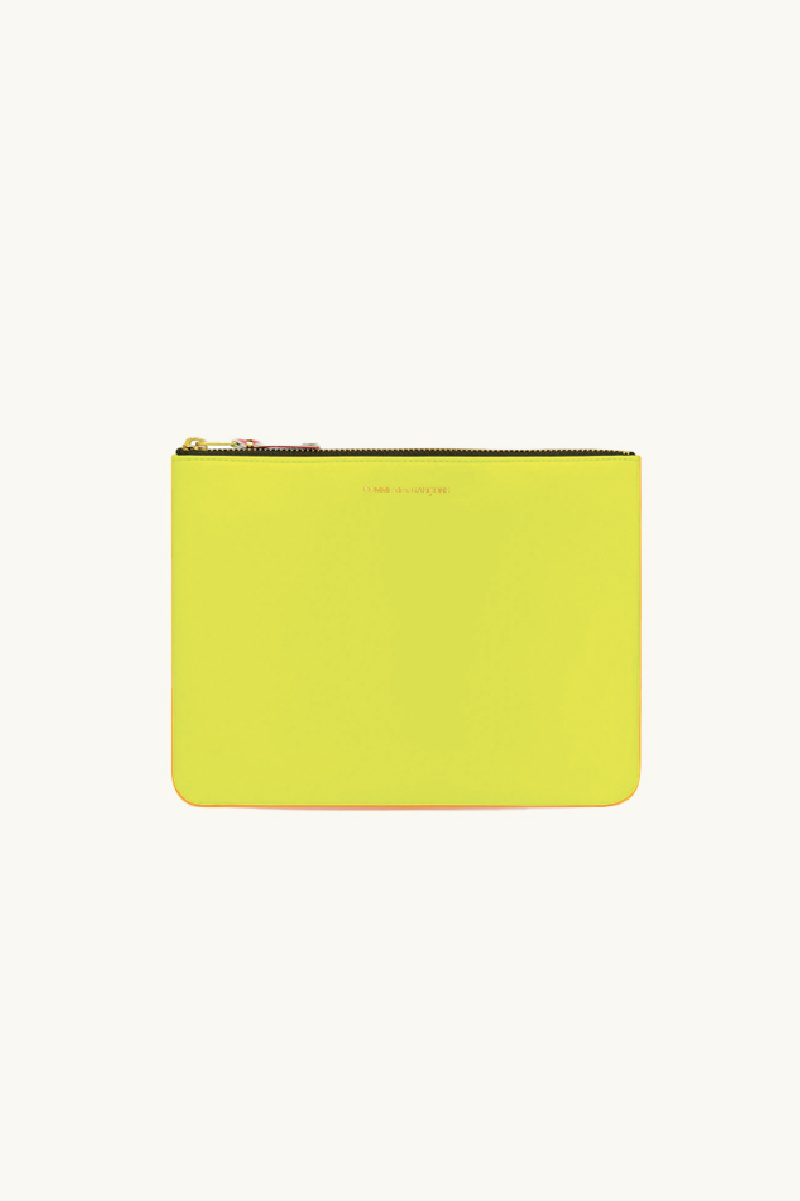 Grande pochette Comme des Garçons, zippée, cuir de chèvre, jaune fluo d’un côté et orange fluo de l’autre, avec inscription signature dorée Comme des Garçons.