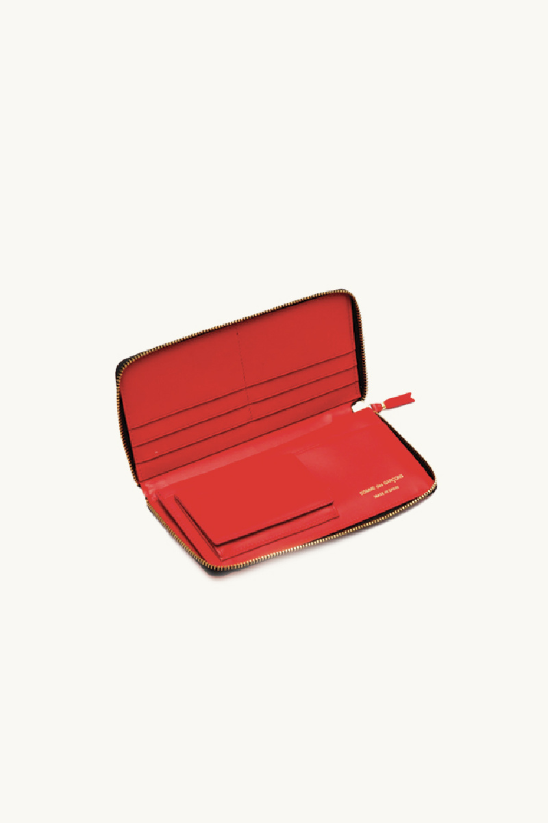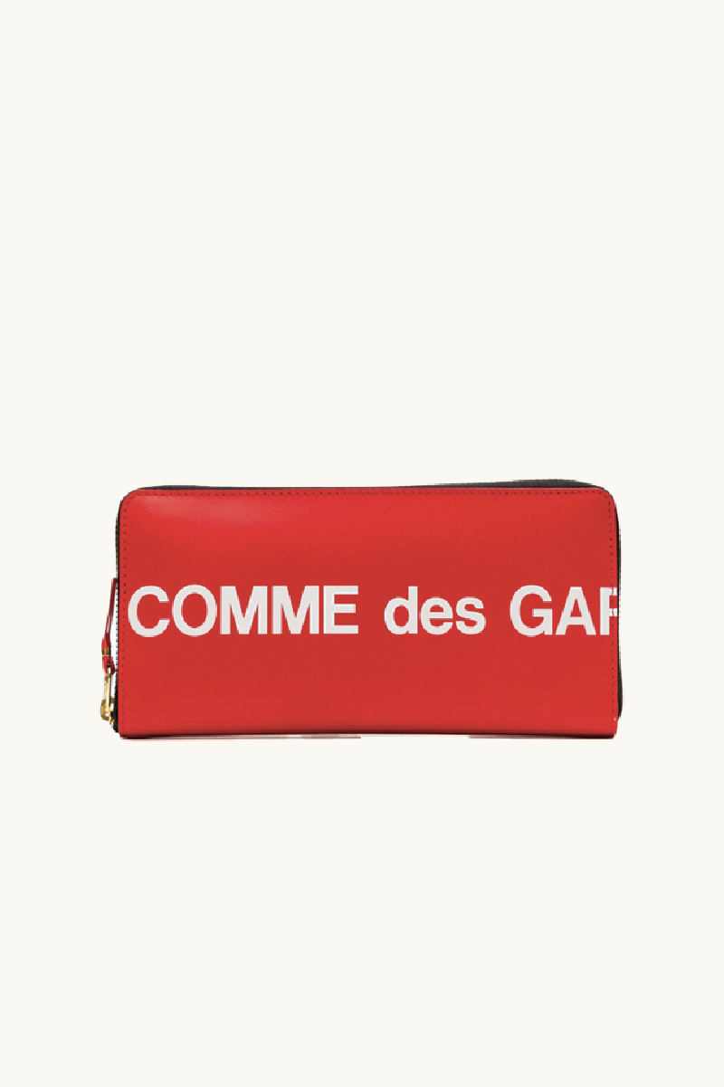 Portefeuille en cuir de chèvre rouge Comme des Garçons avec gros logo blanc imprimé. Intérieur rouge, fermeture zippée, compartiment porte-cartes six encoches et rangement pièces avec fermeture boutonnée.