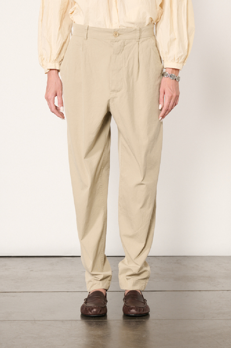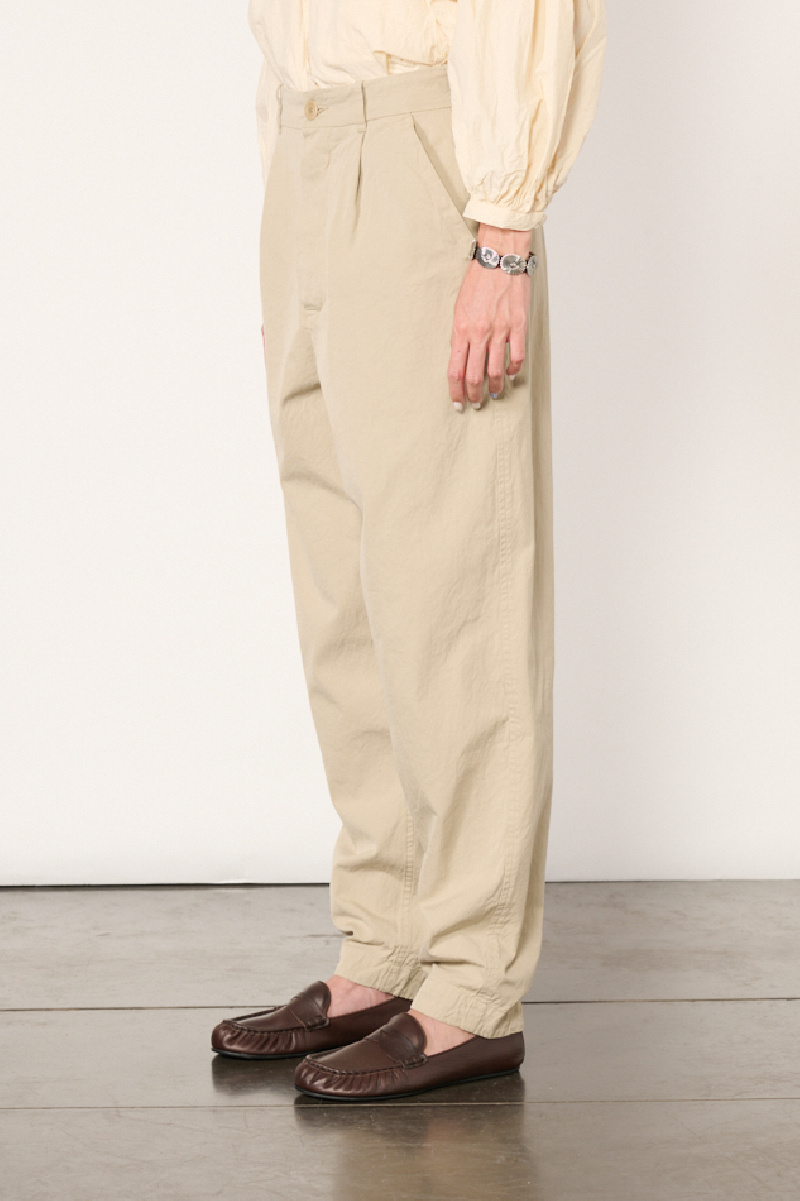 Pantalon Mili Horishi de Casey Casey beige, confectionné en coton double cot, matière emblématique de la marque, avec une finition délavée lui donnant une texture subtile.