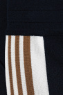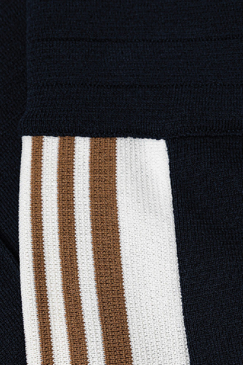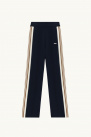 Il présente une coupe droite avec de légères fentes sur le bas, des rayures contrastantes sur les cotés, de couleur beige et blanches, ainsi qu'un logo brodé sur la cuisse gauche.
