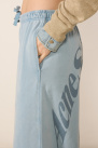 Il offre une coupe ample et une jambe longue, une ceinture élastiquée avec cordon de serrage, deux poches latérales dans les coutres et une grande inscription sur l’arrière.