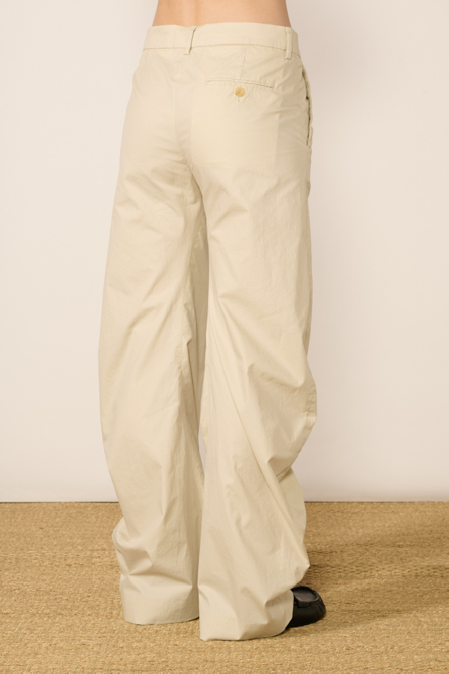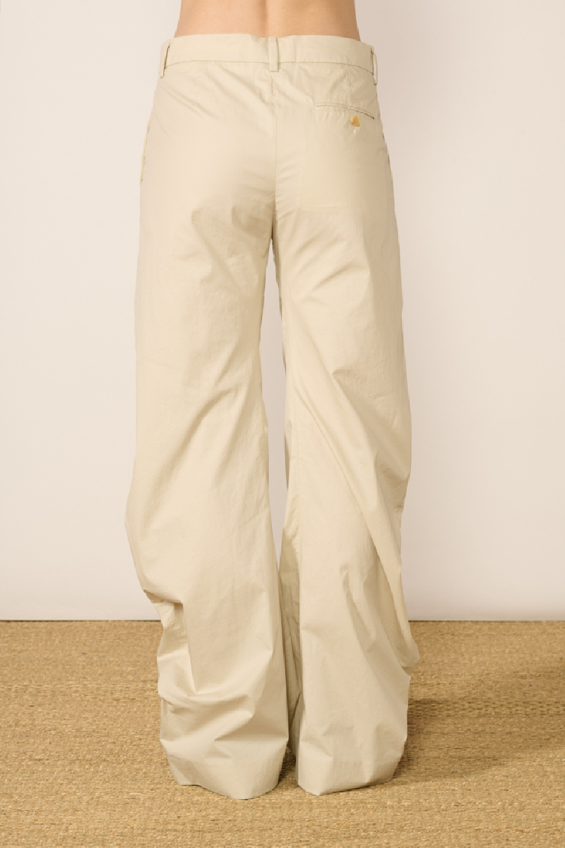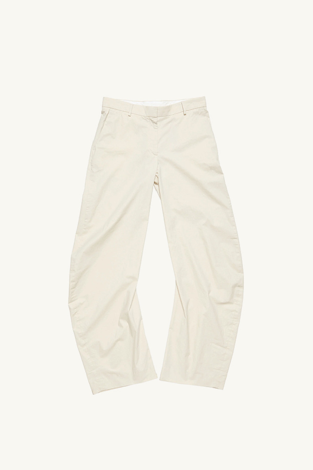 Pantalon confectionné en sergé de coton enduit beige, de la marque Acne Studios.