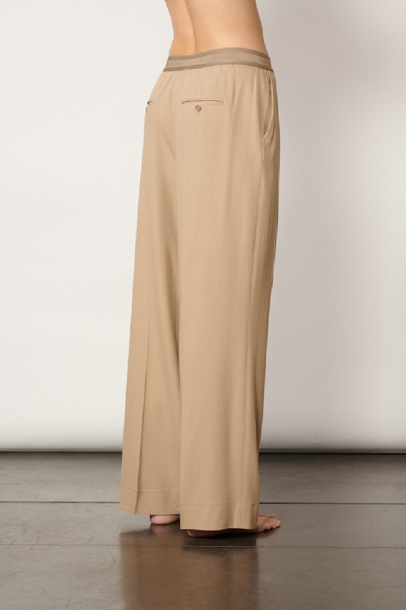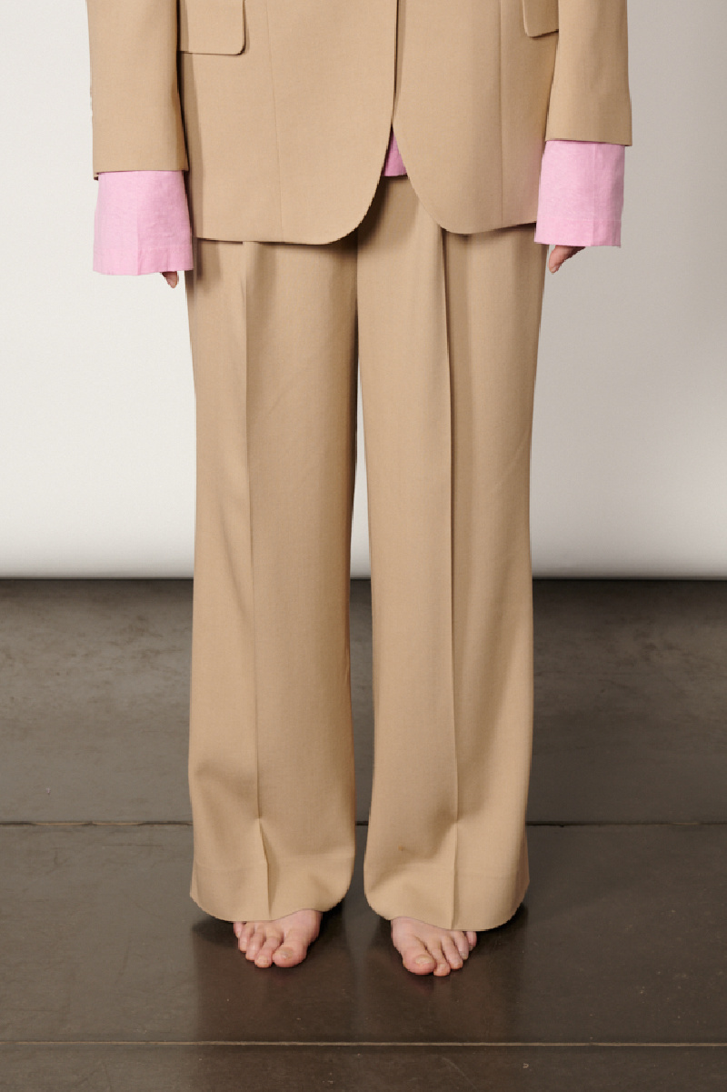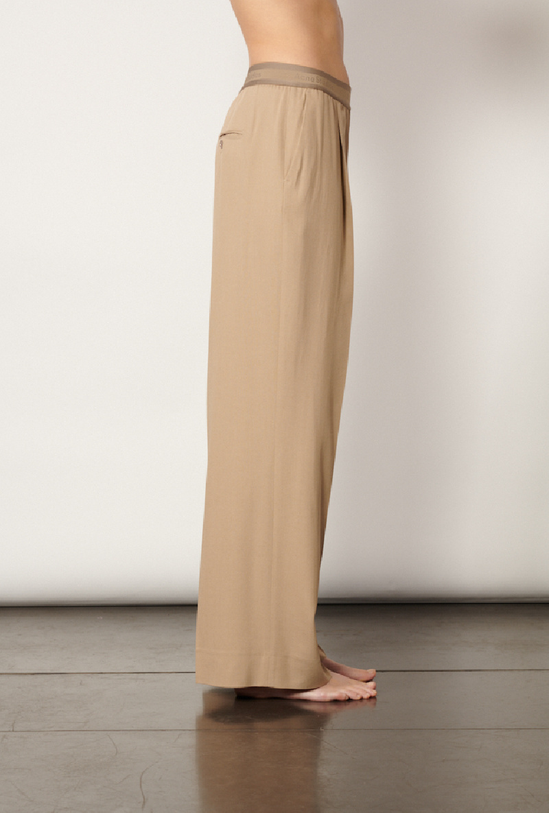 Pantalon beige de la marque Acne Studios, en laine mélangée avec un tissage sergé, offrant un tombé fluide.