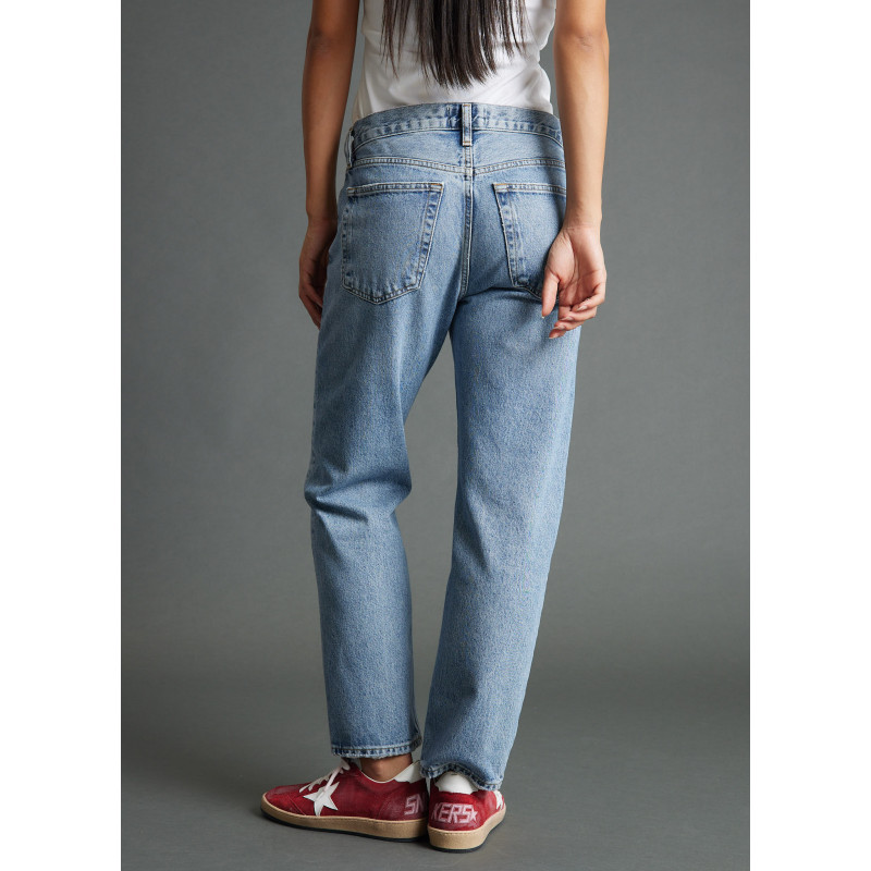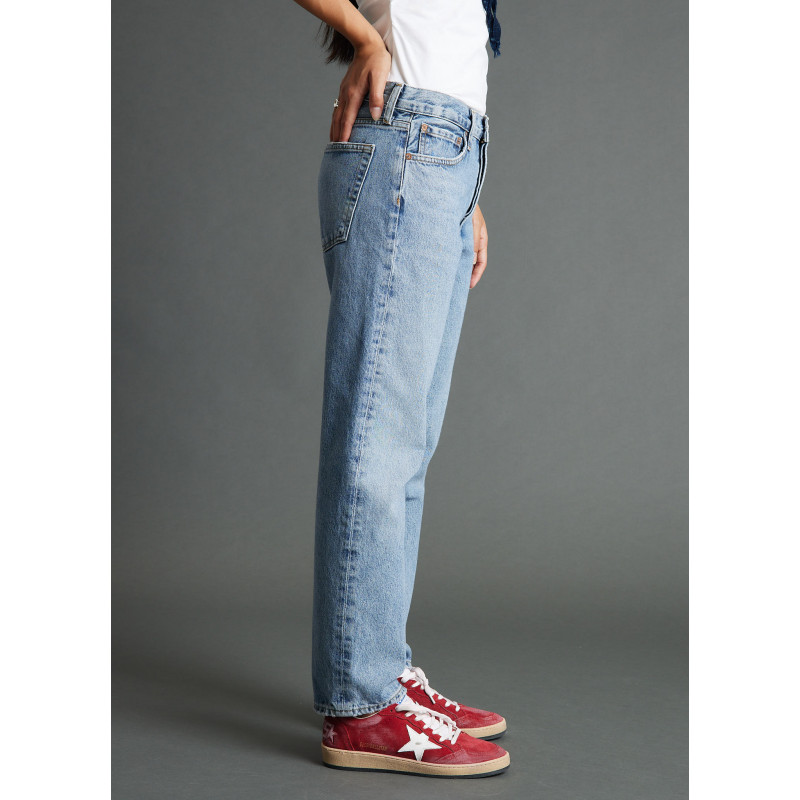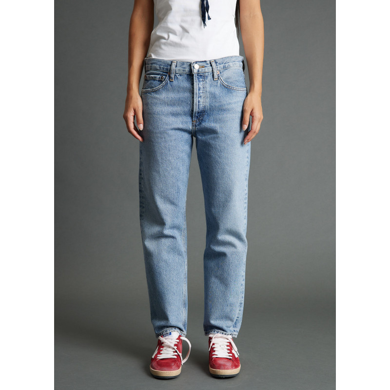 Jean Agolde, couleur bleu ciel, coupe droite, se porte au bas des hanches, denim non extensible, coupe d'inspiration vintage légèrement raccourcie juste au-dessus de la cheville, multiples passants, ourlet droit, fermeture par boutons.