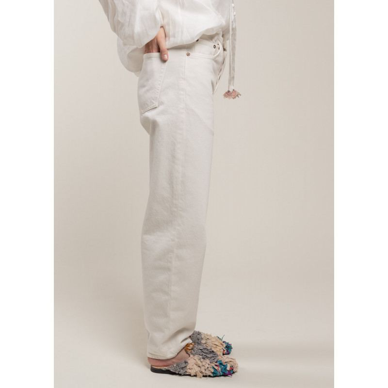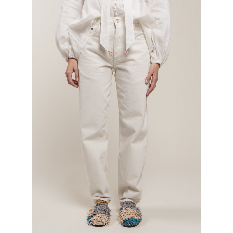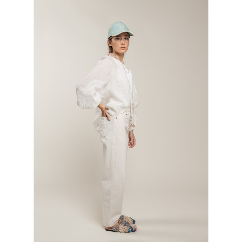 Jean taille mi-haute couleur crème, coupe baggy oversize, cinq poches, fermeture à bouton sous patte, ourlet droit.